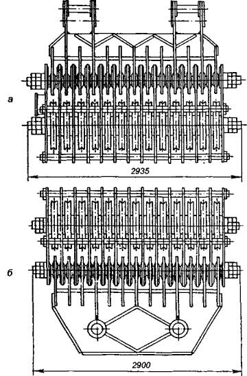 Рис. 1.15. Блочные обоймы ОБМ 630 с тяговой силой 6300 кН: Блоки и обоймы обозначают так: БМ 1,6-1 - блок монтажный, наибольшее тяговое усилие 16 кН, число блоков 1; ОБМ 630-13 - обойма блочная монтажная, наибольшее тяговое усилие 6300 кН, число блоков 13. Полиспаст - устройство, состоящее из подвижной (нижней) и неподвижной (верхней) блочных обойм, соединенных канатом или другим гибким элементом (рис. 1.16). Такое соединение называют запасовкой полиспаста. При этом конец каната жестко крепят к нижней или верхней обойме, а другой - через отводной блок к барабану лебедки. Полиспасты имеют преимущество в силе и скорости. На монтажных работах в основном применяют силовые полиспасты, у которых за счет уменьшения скорости перемещения груза повышается грузоподъемная сила. Наибольшее применение в практике монтажных работ нашли одинарные полиспасты (см. рис. 1.16а), а сдвоенные (см. рис. 1.16б) применяют в тех случаях, когда по условиям монтажных работ требуется полиспастная система с уравнительным устройством и при недостаточности тягового усилия имеющихся в наличии лебедок и блочных обойм.