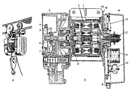 Ручную червячную таль (рис. 1.17а) подвешивают к конструкциям на крюке (3). Приводное колесо (4) связано с червяком, который входит в зацепление с червячным колесом, находящимся на одной ступице со звездочкой (2). Через приводное колесо перекинута сварная калиброванная цепь. Перебирая руками цепь, приводят во вращение колесо, от которого через червячную передачу передается вращение звездочке. Через нижний блок тали и звездочку (5) проходит грузовая цепь (1). При вращении звездочки (2) цепь сокращается по длине и груз, подвешенный к крюку (6), перемещается. В зависимости от направления вращения приводного колеса груз будет подниматься или опускаться. Таль приводят в действие один или два рабочих в зависимости от массы груза. Грузовой крюк может вращаться вокруг своей оси. Для расширения зоны действия таль подвешивают к тележке, называемой кошкой, которая имеет два или четыре ходовых колеса для перемещения по полкам нижнего пояса двутавровой балки. Шестеренную таль (рис. 1.17б) подвешивают к опоре за крюк (3), привод тали осуществляют с помощью бесконечной цепи (7), находящейся в зацеплении с приводным колесом (4). Грузовым элементом в таких талях служит пластинчатая цепь (1) или сварная калиброванная цепь. Поднятый груз удерживают в неподвижном состоянии дисковым тормозом (5), который замыкается массой транспортируемого груза. В этом случае ступицу цепного колеса (4) выполняют в виде гайки, зажимающей храповое колесо (6) тормоза. Собачку (2) тормоза укрепляют на корпусе тали. Электрическая таль (рис. 1.18а) имеет грузоподъемность до 5 т и обеспечивает подъем груза на высоту до 18 м. По сравнению с ручными талями она более производительна, работать с ней легче. Механизм подъема тали (рис. 1.18б) состоит из электродвигателя (2), статор которого запрессован в нарезной барабан (1), вследствие этого уменьшаются длина тали и ее масса. Через двухпарный соосный редуктор (3) крутящий момент ротора двигателя передается на барабан. Таль оборудована двумя тормозами: стопорным колодочным электромагнитным (4) и автоматическим спускным дисковым (7), замыкаемым массой транспортируемого груза. Тормозной шкив (5) стопорного тормоза, снабженный лопастями (6), укреплен на консоли быстроходного вала редуктора и выполняет роль вентилятора, охлаждающего обмотки двигателя. Для улучшения охлаждения корпус редуктора дополнительно снабжен охлаждающими ребрами. Барабан соединен с выходным валом редуктора с помощью муфты (8), компенсирующей неточности монтажа. Со стороны, противоположной редуктору, расположен шкаф электроаппаратуры (14), в нем располагаются пускатели механизма подъема (10, 11), кольцевой токопровод (12) и конечные выключатели (13) подъема и опускания, ограничивающие крайние верхнее и нижнее положения крюка. Кабель управления вводится в шкаф электроаппаратуры через отверстие (9). Канат (15) крепится на барабане с помощью ковша с заливкой. Редуктор и шкаф электроаппаратуры соединены между собой сварным корпусом (16).