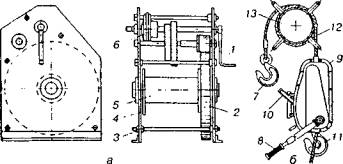 К простейшим грузоподъемным механизмам относятся лебедки, предназначенные для подъема, опускания, перемещения оборудования по горизонтальному или наклонному пути при производстве различных монтажных работ в тех условиях, где нельзя применять краны и другие грузоподъемные устройства. В зависимости от исполнения лебедки можно подразделить: по типу привода - на лебедки с ручным и машинным приводом; по типу тягового элемента - на канатные и цепные; по типу установки - на неподвижные (закрепленные на полу, стене, потолке) и передвижные (на тележках, передвигающихся по полу или по подвесным путям); по числу барабанов - на одно-, двух- и многобарабанные лебедки; по типу барабанов - на нарезные, гладкие и фрикционные. Ручная барабанная лебедка (рис. 1.19а) (табл. 1.8) состоит из двух щек, соединенных болтами (3), образующих станину, в которой установлена ось для свободного вращения барабана (5). Последний получает вращение от рукоятки (1) через зубчатые колеса. Поднимаемый груз в определенном положении удерживается храповым механизмом, состоящим из храпового колеса и собачки. Один конец каната присоединяют к барабану, а за второй крепят крюк.