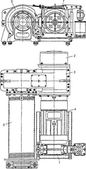 В электрических лебедках (рис. 1.20) (табл. 1.10) барабан (5) получает вращение от электродвигателя (4), укрепленного на корпусе редуктора (3). На свободном конце вала электродвигателя установлен шкив (1) колодочного тормоза, предназначенного для фиксации положения барабана. Направление вращения барабана изменяют путем реверсирования электродвигателя. На втором конце быстроходного вала редуктора установлен электроиндукционный тормоз (2), предназначенный для плавного регулирования скорости опускания груза.