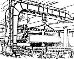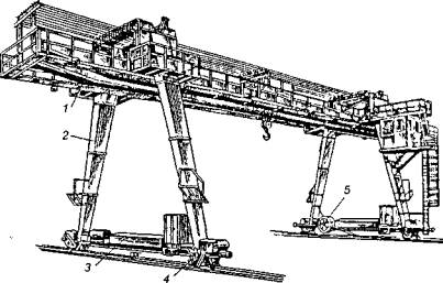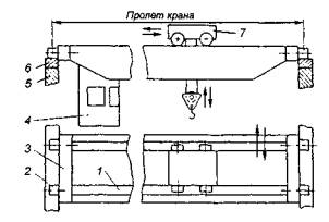 Рис. 1.22. Схема мостового крана Основной характеристикой мостовых кранов является пролет - расстояние между осями крановых рельсов. У двухбалочных кранов опорного типа он составляет 10,5-34,5 м при грузоподъемности 5-500 т. При грузоподъемности до 5 т применяют облегченные одно- и двухбалочные кран-балки, у которых главная балка моста выполнена из двутавровой балки, а вместо крановой тележки используется электроталь. При больших пролетах балки снабжаются фермой, обеспечивающей высокую горизонтальную устойчивость моста. Управление кран-балкой часто осуществляется с пола с помощью подвесных коробок управления и магнитных пускателей. Наряду с кранами опорного типа применяют краны подвесного типа, которые ходовыми колесами опираются на нижние полки двутавровых балок, подвешенных к потолочным конструкциям цеха. Главная балка этих кранов также выполнена из двутавровой балки. При установке моста крана на двух высоких опорных стойках, перемещающихся по рельсам, уложенным на уровне земли, получается козловой кран. Для удобства монтажа его часто изготавливают как самомонтирующийся (рис. 1.23). Мостовое строение (1) собирают на подставках на небольшом расстоянии от земли. Поддерживающие ноги (2) соединяют шарнирами с мостом и балан-сирными тележками. Для подъема моста ноги соединяют полиспастами, канаты которых закреплены на барабанах (5) стягивающих механизмов, имеющих ручной привод. Когда мост занимает рабочее положение, балансирные тележки (4) соединяют балкой (3), а полиспастная система разбирается. Если одна опора крана передвигается по рельсу, уложенному на фундаменте, а вторая - по рельсу, расположенному на эстакаде или подкрановых балках, укрепленных на выступах колонны здания, то получается полукозловой кран (рис. 1.24).