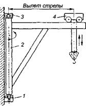 Краны стрелового типа - поворотные на колонне, имеющие постоянный или переменный вылет стрелы. Они бывают стационарные и нестационарные. На рис. 1.25 показана схема стрелового настенного поворотного крана с внешними опорами. Одна из опор (3) воспринимает горизонтальные нагрузки, а другая (1) - горизонтальные и вертикальные. Кран имеет металлоконструкцию (2) Г-образной формы, на которой расположены механизмы подъема груза, передвижения тележки и поворота крана. По верхней поворотной балке металлоконструкции (стреле) перемещается тележка (4) с подвешенным к ней грузозахватным приспособлением. При использовании в качестве верхней балки монорельса вместо тележки применяют электрическую таль, в которой объединены механизмы подъема груза и передвижения электротали.