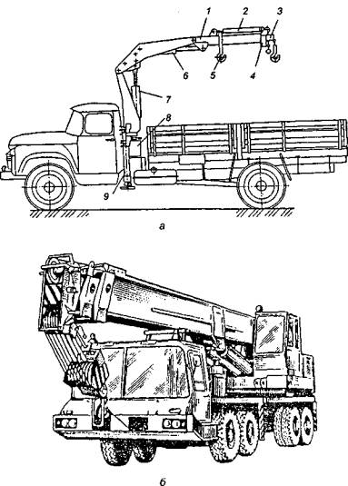 Примечания. 1. Скорость подъема (опускания) груза, удельное давление на грунт применительно к определенной длине стрелы, габаритные размеры необходимо уточнить по паспорту крана. 2. При специальном исполнении крана СКГ-40/63 с дополнительным противовесом массой 6,1 т максимальная грузоподъемность 63 т. Автомобильные краны устанавливаются на стандартных или усиленных (при грузоподъемности до 7,5 т) шасси или специальной ходовой части в виде опорной рамы на пневматических колесах (пневмоколесные краны грузоподъемностью до 100 т). На рис. 1.26а представлен гидравлический (т.е. с гидравлическим приводом механизмов) автомобильный кран, предназначенный для саморазгрузки кузова автомобиля ЗИЛ-130 между кабиной и кузовом. При вылете стрелы 4,5 м грузоподъемность крана равна 1 т, а при вылете 1,8 м - 2,5 т. Максимальная высота подъема крюка от земли 6,16 м. Механизм поворота (8) обеспечивает поворот стрелы на угол 200°. Наличие дополнительного крюка (5) значительно расширяет возможности использования крана. Складывание стрелы осуществляется гидроцилиндром (7), перемещение груза - гидроцилиндром (2), выдвигающим внутреннюю балку (3) из средней балки (4), расположенной в верхнем звене стрелы (1). Скорость подъема груза изменяется от 0,2 до 15 м/мин. Рабочее давление в гидросистеме 10 МПа. Для обеспечения устойчивости крана и разгрузки ходовой части автомобиля кран снабжен выносными опорами (9) с гидравлическим приводом. Привод насоса гидросистемы выполняется через коробку отбора мощности.