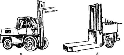 Примечание. 1. Скорость подъема для всех тельферов 8 м/мин, скорость передвижения 2 м/мин. 2. В числителе приведены значения для высоты подъема 6 м, в знаменателе - для 12 м. Для внутрицехового и межцехового транспортирования, а также транспортирования грузов по строительно-монтажной площадке применяют погрузчики, позволяющие производить захват, вертикальное и горизонтальное перемещение грузов и укладку на транспортные средства. Их выполняют на специальных шасси-автопогрузчики и электропогрузчики. Автопогрузчики (рис. 1.27а, табл. 1.21) имеют привод от двигателя внутреннего сгорания и пневматические шины. Их трансмиссия выполнена на базе сборочных единиц автомобилей. Они предназначены для работы на опытных площадках, не имеющих ровного покрытия, грузоподъемность 3 т. Электропогрузчики (рис. 1.27б) имеют механизм передвижения от электродвигателя с питанием от аккумуляторной батареи и массивные пневматические шины. Применяются при работе в закрытых помещениях, грузоподъемность до 1,5 т.