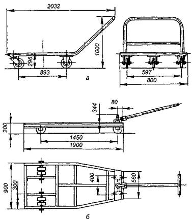 Авто- и электропогрузчики снабжены однотипным рабочим оборудованием - грузоподъемником с набором сменных грузозахватных приспособлений. Грузоподъемник имеет раму, по которой перемещается каретка с грузоподъемным приспособлением. Для удобства захвата, транспортирования грузов рама грузоподъемника может отклоняться вперед на 3-6 м и назад до 10-15 м от вертикального положения. Привод грузоподъемника может быть гидравлическим или механическим. Специальные приспособления и оборудование. Производство монтажных работ на предприятиях по переработке сельскохозяйственной продукции в силу своей специфики (стесненные условия, отсутствие более совершенных грузоподъемных механизмов и др.) требует применения специальных материально-технических средств монтажа. Для транспортировки грузов на монтажных площадках, а также внутри помещений с твердым покрытием применяют тележки различной конструкции (рис. 1.28).