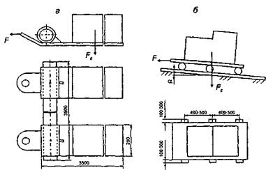 Рис. 1.28. Тележки для перевозки грузов и монтажных заготовок: Для перемещения тяжеловесного оборудования с помощью тягачей или лебедок применяют полозы (рис. 1.29а) из листовой стали толщиной 4 мм, шириной 500-3500 мм, катки (рис. 1.29б), изготовленные из стальных труб Æ 80-150 мм, или бревна их твердых пород дерева 0 150-250 мм. Для горизонтального перемещения легкого оборудования (массой до 2 т) применяют роликовые ломы (рис 1.30). Один конец лома изготовлен в виде лопатки, на верхней поверхности которой сделана насечка, предотвращающая смешение груза.