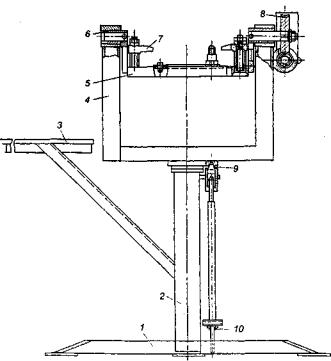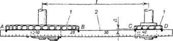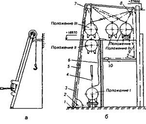Рис. 1.30. Лом роликовый Для монтажа оборудования массой до 1,5 т и трубопроводов, расположенных вдоль стен, используют пристенный подъемник (рис. 1.31а), а для подъема грузов большей массы - Г-образные пристенные подъемники (рис. 1.31б). Шевр из трубы Æ 300 мм, толщиной стенки 8 мм опирается ригелем из балки № 36 на упор (1) в колонне здания. Посредством полиспаста (7) грузоподъемностью 20 т груз поднимают на отметку +19,5 и полиспастом (8), работающим на оттяжке, груз постепенно перемещают в проектное положение. Почти всю нагрузку принимают опоры шевра и опорный ригель, работающий на сжатие и продольный изгиб.