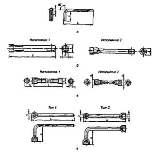 Рис. 1.36. Ключи гаечные односторонние и двусторонние с открытым зевом, комбинированные и кольцевые Торцовые и гаечные ключи выпускают для деталей с шестигранным углублением «под ключ» с размером S 2,5-36 мм (рис. 1.37а, ГОСТ 11737), с внутренним шестигранником односторонние трубчатого (1) и стержневого исполнений (2) с размером S 3,2-75 мм (рис. 1.37б, ГОСТ 25787), с внутренним шестигранником двусторонние трубчатого (1) и стержневого исполнений (2) с размерами зевов Si х S2 от 4 х 5 до 75 х 80 мм (рис. 1.37в, ГОСТ 25789), с внутренним шестигранником изогнутые с размером S 4-55 мм (тип 1) и от 4x4 до 50x50 мм (тип 2), рис. 1.37г (ГОСТ 25788). Для изготовления ключей используют сталей 40Х, 20, 35,40.