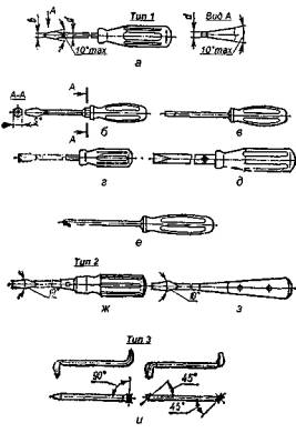 Рис. 1.40. Отвертки слесарно-монтажные тип: 1: На монтажных объектах наиболее широко используют сверлильные машины с электро- и пневмоприводом (табл. 1.22, 1.23), ножевые и вырубные электроножницы, резьбонарезные машины, шпилькогайковерты и гайковерты, угловые и прямые шлифовальные машины и др. Каждая машина характеризуется основным параметром, например: машина сверлильная ИЭ-1023 - ручная, с электроприводом, максимальный диаметр сверления 23 мм; гайковерт ИЭ-3118 - ручная, с электроприводом, диаметр резьбы 12-30 мм; машина резьборезная ИЭ-3401 - ручная, с электроприводом, диаметр резьбы до 12 мм; машина шлифовальная ИП 2015 - ручная, с пневмоприводом, диаметр абразивного круга 100 мм. 1.22. Характеристика ручных машин с пневмоприводом