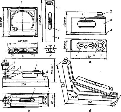 Рис. 1.41. Уровни: а -рамный; б - брусковый: Нивелиры используют при геометрическом нивелировании. Они бывают высокоточные (Н-05, Н-05к), точные (Н-3, Н-3к), технические (Н-10, Н-10к). Наибольшее распространение получили нивелиры Н-05 и Н-3, средняя квадратическая погрешность на 1 км двойного хода (а) составляет соответственно 0,5 и 3 мм. Для грубых работ применяют нивелиры Н-10 (s = 10). При монтаже оборудования и конструкций, а также приемке геодезической основы строительной части зданий и фундаментов под монтаж используют теодолиты. Новые теодолиты 212 и 215 полностью соответствуют требованиям ГОСТ 10529. К конструкции теодолита максимально приближается конструкция лазерного визира ЛВ-5М, позволяющего задавать оптическим лучом определенное направление в пространстве - опорную линию, относительно которой производят необходимые измерения. Лазерный визир ЛВ-5М можно применять в сочетании с визуальными и фотоэлектрическими методами индикации оси светового луча. Для централизации оптико-механических приборов над точкой, а также вертикального проектирования точек переноса осей применяют отвесы, состоящие из тонкой нити с грузом. Конструкция груза может быть самой разнообразной: отвесы с грузом, имеющим подсетку острия, и т.п. Амплитуда колебаний и искривление нити отвеса под действием потоков воздуха зависят от диаметра нити и массы груза, поэтому при монтаже оборудования применяют отвесы из тонкой проволоки. Стальные строительные отвесы с трехпрядными капроновыми шнурами выпускают по ГОСТ 7948. При монтаже оборудования для проверки точности разбивки осей, контроля отклонений формы поверхностей оборудования, расположения его сборочных единиц и деталей применяют струны. В качестве струн применяют стальную проволоку, реже - нити из капрона и нейлона. Наиболее целесообразно использовать в качестве струн стальную проволоку марки ОВС по ГОСТ 2771 Æ 0,2-0,4 мм. Для хранения и воспроизведения единицы длины, проверки и градуировки штриховых мер и измерительных приборов, установки прибора на ноль при измерении по методу сравнения, при установке регулируемых калибров на размер, а также для особо точных измерительных разметочных работ и наладки при монтаже применяют концевые меры. Размеры, точность и технические условия для концевых мер длины регламентированы ГОСТ 9038. Номинальные размеры концевых мер длины имеют градацию, которая позволяет составлять блоки с номинальными размерами через 0,001 мм. Точность изготовления концевых мер длины регламентирования классами точности 00, 01, 1, 2, 3. Классификация по классам точности проводится в зависимости от отклонений от параллельности и качества притираемых рабочих поверхностей. Меры комплектуют в наборы. Наиболее широко применяют набор, состоящий из 112 концевых мер, с наибольшим размером меры 100 мм. В наборе имеются следующие меры: 1 - размером 1,005 мм, 51 - размером 1-0,5 мм через 0,01 мм, 5 - размером 1,6-2 мм через 0,1 мм; 1 - размером 0,5 мм; 46 - размером 2,5-25 мм через 0,5 мм и 8 - размером 30-100 мм через 10 мм. Для проверки и настройки угломерных приборов, измерения методом сравнения применяют угловые призматические меры, выпускаемые по ГОСТ 2875 пяти типов: с одним рабочим углом со срезанной вершиной; с одним рабочим углом с несрезанной вершиной; с четырьмя рабочими углами; многогранные призмы с различным числом граней; с тремя рабочими углам