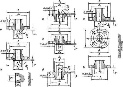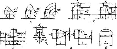 Рис. 1.42. Детали трубопроводов из углеродистой стали: Детали трубопроводов Ду 500-1400 мм из углеродистой стали на ру=2,5 МПа изготовляют сварными, отводы - штампосварными и секционными сварными, тройники - равнопроходными, переходы концентрические и эксцентрические - штампосварными и сварными. Типы фланцев, их присоединительные размеры и размеры уплотнительных поверхностей (рис. 1.43) установлены в зависимости от величины условных проходов (Ду) и давлений (ру) по ГОСТ 12815. Наиболее часто используются фланцы литые стальные (ГОСТ 12819), стальные плоские приварные (ГОСТ 12820), стальные приварные (ГОСТ 12821).