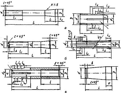 Рис. 1.44. Самоанкерующиеся болты и дюбели: Самоанкерующийся болт первого типа состоит из шпильки с конической частью и цанги, которая внизу имеет четыре продольные прорези. Верхняя сплошная часть цанги обеспечивает ограничение величины распора. Диаметр резьбы болтов от М8 до М36. Самоанкерующийся болт второго типа состоит из шпильки с конической частью и разрезной трубчатой цанги с тремя продольными прорезями в нижней части. Диаметр резьбы шпильки от М12 до М24. Болты применяют для крепления оборудования и металлоконструкций к чистым полам без устройства фундаментов. Их устанавливают в отверстия, просверленные с помощью перфораторов ИЭ-4709, ИЭ-4712 или электросверлильных ручных машин С-455, ЭР-16, ИЭ-1015. Для крепления оборудования и металлических конструкций к несущим строительным конструкциям используют распорные дюбели-втулки, представляющие собой изделия, состоящие из распорной втулки с внутренней резьбой и четырьмя прорезями и конического элемента, устанавливаемого в отверстие втулки. Распорную втулку концом с прорезями помещают в отверстие, предварительно пробуренное в материале. Затем в отверстие втулки устанавливают конический элемент, в результате происходит раздвижение конической части втулки и ее прижатие к стенке отверстия несущего строительного элемента. Оборудование или металлические конструкции закрепляют с помощью шпилек или болтов, ввинченных в резьбовые отверстия втулок. Для уплотнения фланцевых и муфторезьбовых соединений трубопроводов, арматуры и аппаратуры, а также установки между корпусом и крышкой арматуры применяют прокладки различной конструкции из листовой резины (тепло-, морозо-, кислощелочестойкая - ТМКЩ, повышенно маслобензостойкая - ПМБ, пищевая), паронита (общего назначения - ПОН, маслобензостойкий - ПМБ), картона, асбестовой бумаги и др. При уплотнении валов и штоков трубопроводной арматуры используют сальниковые набивки квадратного и круглого сечений, которые бывают следующих видов: хлопчатобумажная сухая (ХБС), хлопчатобумажная пропитанная (ХБП), асбестовая пропитанная (АС), асбестопроволочная (АПР), асбестовая маслобензостойкая (АМБ), асбестовая прорезиненная графитированная (АПП), асбестовая прорезиненная сухая с латунной проволокой (АПРПС). Сальниковые набивки подбирают по максимально допустимым параметрам (температура, давление), размерам (сторона квадрата или диаметр), уплотняемой среде (сжатый воздух, пар, агрессивный газ, вода и т.п.). В качестве обтирочных материалов используют салфетки из бязи, хлопчатобумажные суровые нитки, хлопчатобумажную, льняную и полульняную, джутовую, джутотканную и другую ветошь. Обтирочная ветошь может быть любой формы площадью не менее 400 см2, шириной не менее 20 см. В обтирочной ветоши площадью 400 см2 допускаются дыры площадью не более 5%, а в ветоши площадью не более 400 см2 - не более 155% от общей площади. Кондиционная влажность ветоши не более 12%. При проведении притирочных и доводочных работ используют твердые (выше твердости закаленной стали) и мягкие (ниже твердости закаленной стали) абразивные материалы. К твердым относят шлифпорошки зернистостью 12, 10, 8, 6, 4 и микропорошки от М63 до М5 из корунда, электрокорунда (белого, нормального и легированного), карбида кремния, карбида бора и синтетических алмазов. Мягкими являются абразивные порошки оксида хром