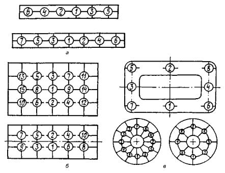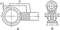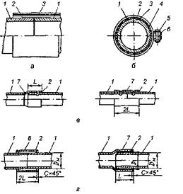 Рис. 1.45. Схемы клеевых соединений трубопроводов: Выбор и расчет материально-технических средств монтажа. Выбор того или иного типа грузоподъемной машины, механизма и приспособлений для производства погрузочно-разгрузочных и монтажных операций осуществляют на основе анализа следующих факторов: требуемая грузоподъемность, характеристика перемещаемого груза, режим работы, вид энергии, приводящей машину в действие и др. Канат на прочность рассчитывают по формуле P/S ³ К, где Р - разрывное усилие каната в целом, Н (принимается по ГОСТ или сертификату); S - усилие на канат, Н; К - коэффициент запаса прочности для пеньковых принимают не менее 8, а для стальных - в зависимости от назначения каната и характеристики грузоподъемных машин, для машин с ручным приводом он составляет 4, с машинным приводом и легким (средним) режимом работы - 5-5,5, у стрелового, являющегося растяжкой расчалки - 3,5, для полиспастов равен 3,5-5, для расчалок и оттяжек - 3-5. Значения S для канатов полиспаста, стропов и расчалок определяют по формуле S = Q/n · cosa, где Q - расчетная нагрузка, приложенная к подвижному блоку полиспаста (расчалке, стропу); a - угол между осью действия расчетного усилия и ветвью каната; n - общее число ветвей каната. Допустимый диаметр (мм) барабана лебедки или блока, измеряемый по средней линии навитого стального каната, определяют по формуле D = d·e, где d - диаметр каната, мм; е - коэффициент, значение которого зависит от типа грузоподъемной машины и режима работы (для электрических талей е=22, ручной лебедки е=12, машинной е=20, для грузоподъемных машин с машинным приводом и тяжелым режимом работы е=30). 1.3. Технология монтажа оборудованияМонтаж типовых сборочных единиц оборудования Технические требования на монтаж типовых сборочных единиц (рамы, редукторы, резьбовые, шлицевые и шпоночные соединения, ремонтные и цепные передачи, муфты, подшипники, запорная и регулирующая аппаратура, санитарные приборы) являются общими. Рама - основная базовая часть машины или оборудования, предназначенная для установки на ней деталей, сборочных единиц и механизмов. Представляет собой сварную конструкцию. Неправильное ее положение при монтаже ведет к преждевременному выходу машины из строя. Поэтому перед установкой рамы в проектное положение проверяют ее целостность, жесткость, отсутствие деформаций. Устанавливают раму на фундамент и выверяют ее положение в горизонтальной и вертикальной плоскостях по уровню, при необходимости подкладывают под основание металлические подкладки, собираемые в пакеты. Число подкладок в пакете - не более пяти, включая тонколистовые, применяемые для окончательной выверки. После установки рамы на подкладки частично затягивают фундаментные болты, а затем контролируют ее положение. При необходимости раму приподнимают, добавляют в пакеты тонколистовые подкладки или заменяют ранее установленные подкладками другой толщины. Затем вновь затягивают фундаментные болты и контролируют положение рамы. Затягивают болты после полного затвердения бетона с помощью гаечных ключей с определенной силой, контролируемой по крутящему моменту, который измеряют с помощью предельных и динамометрических ключей. После окончательной затяжки болтов подкладки прихватывают между собой сваркой. Конец фундаментного болта должен выступать над плоскостью гайки не б