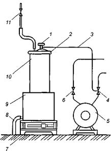 Рис. 2.7. Схема заправки компрессора: Замкнув клеммы реле давления всасывания, включают компрессор и снижают в нем давление. При появлении вакуума в компрессоре открывают запорный вентиль и наблюдают через смотровое кольцо за уровнем масла в компрессоре. При достижении требуемого уровня масла закрывают запорный вентиль и выключают компрессор. Масло должно закрывать 2/3 смотрового стекла. Затем всасывающий вентиль устанавливают в положение «Открыто», пробку отвинчивают, маслонаполнительную трубку снимают, всасывающий вентиль устанавливают в положение «Рабочее» и снимают перемычку с клемм реле давления всасывания. У котлов-парообразователей при ЕТО проверяют техническое состояние приборов автоматики, арматуры, питательного насоса, топочных дверей, колосников, дымовой задвижки, вентиляторов, убеждаются в отсутствии утечек топлива, воды, пара из трубопроводов, проверяют состояние и правильность регулировки предохранительных клапанов, работу регулятора уровня воды, устраняют отмеченные недостатки, запускают котел в работу и убеждаются в нормальном сгорании топлива. Один раз в месяц выполняют операции ЕТО, кроме того, очищают дымовую трубу и коробку от сажи, удаляют накипь с поверхностей котла, промывают топливные фильтры, проверяют и подтягивают сальниковые набивки вентилей и кранов водопроводной и паропроводной систем, проверяют техническое состояние водомерного устройства, очищают от накипи и при необходимости заменяют прокладки водомерного стекла, от нагара - распылитель, камеру газификации горелки и свечу запала, от накипи- электроды датчика уровня, придонную часть барабана - от шлама, регулятор уровня - от шлама и грязи, подтягивают подвижную гайку сальника топливного насоса, проверяют техническое состояние вентиляторов, срабатывание приборов безопасности при искусственном создании аварийных режимов (два раза в год выполняют указанные операции), техническое состояние питательного насоса, удаляют из подшипников отработавший смазочный материал и заполняют их новым, сливают топливо из бака, удаляют отстой воды и грязи, промывают отстойник и заполняют бак топливом, проверяют техническое состояние системы зажигания и горелки, регулируют ее производительность и оптимальное сгорание топлива на максимальном и минимальном режимах, проводят гидравлическое испытание котла, восстанавливают поврежденную окраску. Отмеченные недостатки устраняют. Перед началом работы у неработающего вакуумного котла КВМ-4,6А проверяют наличие воды в ловушке мановакуумметра, при необходимости доливают воду, прочищают подводящие трубопроводы от котла к ловушке через узел прочистки, проверяют наличие и исправность шплинтов на осях крепления бугеля загрузонной горловины и крепления рычага и серьги разгрузочной горловины, наличие предохранительных устройств загрузочной и разгрузочной горловин и сливных кранов, прочищают пробные краны на крышке загрузочной горловины, смазывают подшипниковые узлы вала мешалки, проверяют правильность соединения "гайка-втулка" и пары "винт-гайка" крышки загрузочной горловины с бугелем, наличие смазки в паре "винт-гайка" крышек нагрузочной и разгрузочной горловин, при необходимости производят смазывание, проверяют состояние внутренней полости отражателя и употнительной поверхности крышки за