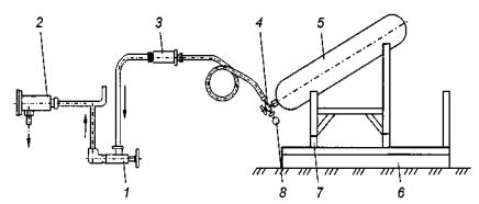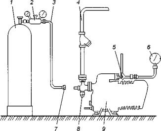 Рис. 2.3. Схема испытания системы давлением газа: При обнаружении утечки газа понижают давление в системе до атмосферного, ослабив накидную гайку на штуцере редуктора. Устранение неплотностей в системе, находящейся под давлением, не допускается. После устранения неисправностей вновь доводят давление газа до 1,25 МПа и выдерживают систему под таким давлением 24 ч. Систему считают выдержавшей испытание, если в ней сохраняется указанное давление. Затем вентиль устанавливают в положение «Открыто», снимают медную трубку, отвинчивают накидные гайки со штуцера редуктора, выпускают газ из системы, завинчивают трубку манометра на штуцер тройника всасывающего вентиля, снимают редуктор и навинчивают на баллон защитный колпак. Системы холодильных машин ХМ-ФУ401, ХМ-ФУУ801 заправляют хладагентом следующим образом. Баллон с хладоном (рис. 2.4) и подставкой устанавливают на весы и взвешивают. Наполнительную трассу присоединяют одним концом к вентилю на баллоне, другим через технологический фильтр-осушитель - к наполнительному вентилю на фильтре-осушителе регулирующей станции. Открывают (рис. 2.5) электромагнитный вентиль, вентиль на баллоне, а затем наполнительный вентиль системы. Система должна заполняться самотеком. После прекращения поступления хладона самотеком закрывают вентиль на выходе из ресивера и всасывающий вентиль компрессора, пускают воду в конденсатор и запускают рассольный насос, после этого включают компрессор. Постепенно открывая всасывающий вентиль, откачивают часть хладона в ресивер и конденсатор. Давление всасывания должно быть не ниже 0,215, а в конденсаторе - не выше 0,9 МПа. Затем определяют количество хладона, заправленного в систему, периодически взвешивая баллон с хладоном и подставкой. В систему холодильной машины, например, ХМ-ФУ401 должно быть заправлено 140-150 кг хладона.