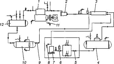 Рис. 2.2. Схема откачки хладона в баллон: После отключения машины (рис. 2.3) баллон устанавливают в непосредственной близости от компрессора. Затем на штуцер баллона монтируют редуктор, а шпиндель всасывающего вентиля переводят в положение «Открыто». Со штуцера вентиля отвинчивают трубку мановакуумметра. Навинчивают на него накидную гайку медной трубки. Соединения должны быть плотными, трубка - отожженной. Перед закреплением гайки трубку продувают газом. Вентиль устанавливают в положение «Рабочее», а запорные вентили с электромагнитными приводами - в положение «Открыто». Затем открывают вентиль на баллоне и редуктором создают в системе требуемое для испытания давление - 1 МПа. После этого закрывают вентиль и проверяют систему на герметичность. Обмыливанием возможных мест утечки газа из системы (резьбовые, фланцевые, сварные и паяные соединения, места изгиба труб и т.п.). Мыльный раствор должен содержать 10% глицерина и не должен быть вспененным.