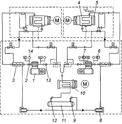 Рис. 2.6. Схема холодильно-нагревательных машин ХМФ-32 (ХМФ-16): Компрессор заправляют маслом при отключенной холодильной машине в следующей последовательности (рис. 2.7). Всасывающий вентиль устанавливают в положение «Открыто», накидную гайку трубки мановакуумметра отвинчивают от штуцера всасывающего вентиля, к штуцеру подсоединяют маслонаполнительную трубку. Соединения должны быть герметичными, свободный конец трубки - погружен в масло, а вентиль - закрыт.