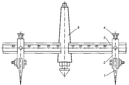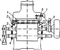 Рис. 4.31. Центробежная фрикционная муфта сепаратора: При ремонте муфты сепаратора ее следует разобрать, для чего снимают электродвигатель со станины. На валу двигателя остается диск с колодками. Колодки и соответствующие им оси маркируют, например, кернением. Это необходимо для того, чтобы после ремонта колодки были установлены на свои оси во избежание нарушения балансировки муфты. Для снятия колодок с осей удаляют шплинты, снимают шайбы и колодки с накладками. Замасленные накладки промывают в бензине. Изношенными считаются накладки, толщина которых уменьшилась на 50%. Перед установкой колодки с накладками взвешивают, расхождение их по массе не должно превышать ±3 г. Колодки ставят на оси, надевают на них шайбы и вставляют шплинты. Затем колодки сводят вместе, скрепляют и устанавливают электродвигатель на станину. Диск с колодками заводят в бандаж, закрепленный на горизонтальном валу сепаратора, и прикрепляют двигатель к станине. После этого проводят пробный пуск. При пуске может появиться дым, что допустимо, так как накладка еще не приработалась к бандажу. Для определения потери упругости пружин горловой опоры измеряют их высоту, осевшие пружины заменяют. При осадке хотя бы одной из пружин горловой опоры необходимо заменить весь комплект. Новые пружины должны иметь одинаковую упругость, которую определяют, измеряя их высоту в свободном и сжатом (витки должны соприкасаться) состояниях. При этом отклонение не должно превышать ±0,3 мм. Для обеспечения одинаковой упругости пружин в рабочем состоянии, т.е. при вращении веретена, в процессе сборки горловой опоры пробки пружин следует завинчивать до отказа. Балансировку барабанов выполняют на специальных станках или на приспособленных для этого станинах сепараторов, в которых против верхней части веретена делают вырез. При проверке сбалансированности барабану сообщают номинальную частоту вращения и после отключения от привода наносят карандашом отметки в местах наибольшего биения. Положение дисбаланса вначале определяют, касаясь карандашом внутренней поверхности центральной трубки (рис. 4.32). Для уравновешивания на кожух барабана с противоположной стороны карандашной отметки изнутри крышки барабана наплавляют олово. Аналогично устраняют биение веретена.