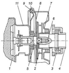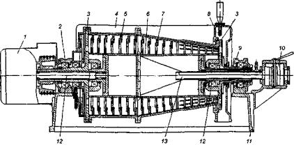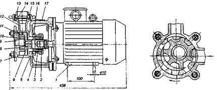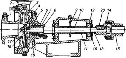 Рис. 4.38. Ротационные насосы типа НРМ-2: Величину зазоров измеряют щупом. Чтобы уменьшить торцевой зазор, торцевую сторону крышки и серповидного выступа протачивают. При ремонте порядок разборки центробежных насосов разных марок зависит от конструктивных особенностей. У центробежных насосов типа К сначала снимают всасывающий патрубок (рис. 4.39) и рабочее колесо, а затем отсоединяют спиральный корпус от опорного кронштейна. Вал в сборе с подшипниками выпрессовывают из опорного кронштейна после снятия с вала полумуфты и распорной втулки и отсоединения крышек подшипника от кронштейна. Центробежные насосы собирают в порядке, обратном разборке. Детали должны иметь размеры, соответствующие нормативно-технической документации на ремонт. При сборке это обеспечит требуемые натяги и зазоры в сопряжениях и хорошее качество сборки (вал насоса должен вращаться плавно, без заеданий). После сборки насосы подвергают обкатке и испытанию на испытательных стендах или непосредственно на месте установки.