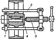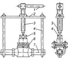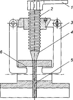 Рис. 2.10. Приспособление для перенабивки сальников: Прокладки в местах фланцевых соединений арматуры с трубопроводом заменяют в следующем порядке. С помощью приспособления (рис. 2.11) вырезают прокладки нужного размера, отворачивают гайки болтов фланцевых соединений и вынимают болты из отверстий. Вводят (рис. 2.12) захваты в отверстия фланцев. В торцевую выточку винта устанавливают распорный клин и вращением винта рукояткой вдавливают клин в зазор между фланцами, раздвигая их. Поврежденную прокладку вынимают и ставят на ее место новую, снимают приспособление, вставляют болты и плотно затягивают