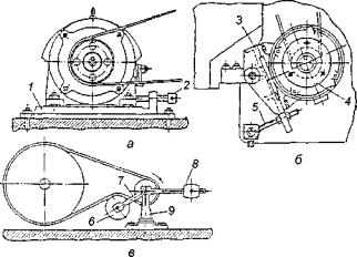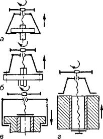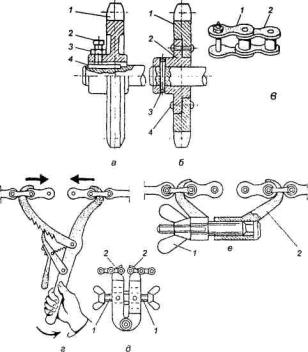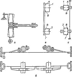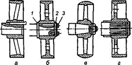 Рис. 4.46. Установки шкивов ременной передачи на валу с помощью клиновой (а) и призматической (б) шпонок, на конической шейке вала (в) и посредством шлицевого соединения (г) Для установки шкивов на валы используют различные винтовые приспособления (рис. 4.47). Разъемный хомутик надевают на вал и упирают в буртик. Тяги приспособления пропускают между спицами шкива, а на его ступицу монтируют прокладку. При вращении винта шкив постепенно напрессовывается на вал. Одновременно с вращением винта наносят легкие удары по прокладке во избежание перекоса шкива.