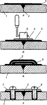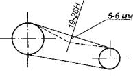 Рис. 4.28. Схема расположения клинового ремня: Чугунные шкивы перед заваркой нагревают равномерно по всему диаметру, чтобы свести к минимуму внутренние напряжения на завариваемом участке, вызывающие образование трещин в других местах ремонтируемой детали. Заварку можно выполнять различными способами. В ремонтном производстве широко используют газовую сварку трещин цветными сплавами. В качестве присадочного материала используют латунь, которая более всего соответствует требованиям сварки по сравнению с другими цветными сплавами на медной основе. Температура плавления латуни (880-950°С) меньше температуры плавления чугуна, поэтому латунь можно применять для заварки, не доводя материал детали до плавления и, следовательно, не вызывая в нем значительных структурных изменений и внутренних напряжений. При правильном выполнении требований технологии заварки трещин с использованием латунной присадки обеспечиваются достаточно высокие механические свойства шва, который получается плотным и легко обрабатывается. Для заварки выполняют следующие операции. С кромок трещин снимают фаски так, чтобы угол разделки был 70-80°, затем их подвергают грубой обработке с образованием насечек. Места заварки зачищают, подготовленные места подогревают пламенем газовой горелки до температуры 900-950°С. На поверхность наносят слой флюса, нагревают в пламени горелки конец латунной проволоки, которым натирают нагретые кромки трещины так, чтобы латунь покрыла поверхности фасок тонким слоем. Конец латунной проволоки периодически погружают во флюс. После нанесения тонкого слоя латуни трещину полностью заваривают. Затем пламя горелки медленно отводят от ремонтируемой детали, а шов покрывают листовым асбестом. При правильно выбранном температурном режиме процесса латунь покрывает поверхности фасок ровным и плотным слоем. Чрезмерно высокая температура приводит к образованию окиси цинка, которая покрывает белым налетом пришовную зону. При недостаточной температуре на фасках образуются шарики латуни. После окончания заварки трещин шкив погружают в нагретый песок для медленного равномерного остывания. При использовании холодной заварки трещин в шкивах из чугуна деталь нагревают по всему диаметру до температуры, не превышающей 40°С, для снятия имеющихся напряжений и предупреждения возникновения сварочных напряжений. Сварочная ванна имеет незначительный объем металла и быстро твердеет. При заварке трещин в шкивах из алюминиевых сплавов возникают трудности, которые связаны с тугоплавкостью пленки окислов (Аl2О3) на поверхности ремонтируемых деталей, температура плавления которой составляет 2050°С. Пленка мешает заварке трещин, так как температура плавления алюминия составляет 658°С. Коэффициент линейного расширения алюминия и его сплавов в 2 раза, а теплопроводность - в 3 раза больше, чем у стали, что может привести к значительным деформациям ремонтируемой детали. Заварку трещин осуществляют газовой и дуговой сваркой с использованием металлического или графитового электродов. При ручной заварке трещин применяют металлические электроды со специальной обмазкой. Сварку в инертном газе осуществляют при подаче в зону сварки струи аргона, который защищает шов от окисления. Лучшим способом является заварка с наложением продольного магнитного по