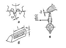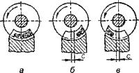 Рис. 4.45. Проверка установки звездочек на валы: На цилиндрические шейки шкивы устанавливают посредством клиновых (рис. 4.46а) или призматических (рис. 4.46б) шпонок. При использовании последних на валу делают буртик (1) для фиксации шкива в осевом направлении. Шкив крепят гайкой или шайбой (2) со стопорным винтом (3). Такое же крепление используют при установке шкива на коническую шейку вала (рис. 4.46в). При применении клиновых шпонок дополнительного крепления шкивов не требуется. Эти шпонки используют только в тихоходных передачах, так как они не препятствуют осевому смещению ступицы, что недопустимо в быстроходных передачах. При небольшой длине ступицы указанное смещение может привести к перекосу шкива на валу. При повышенных требованиях к точности расположения шкива применяют шлицевое соединение (рис. 4.46г), которое обеспечивает большую точность центрирования и меньший износ посадочных мест в процессе эксплуатации передачи.