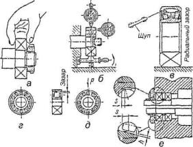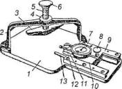электродвигателя: Вывод ротора из расточки статора очень ответственная операция, так как даже незначительное задевание ротора за сердечник или обмотку может привести к серьезным повреждениям. В небольших электродвигателям после выемки обоих подшипниковых щитов вручную вынимают ротор. В крупных электродвигателях ротор вынимают подъемными приспособлениями, например, электротельфером. При выводе ротора следят за тем, чтобы он двигался строго по оси расточки статора. Для этого используют приспособления вывода и ввода ротора в расточку статора. Таким приспособлением оборудуется стол-тележка для проведения текущих ремонтов электродвигателей. Снятие подшипников качения и их замену проводят в случае выкрашивания металла, при появлении трещин, а также цветов побежалости на поверхности колец и тел качения подшипника, отсутствии или ослаблении заклепок сепаратора, наличии забоин и вмятин на сепараторе, препятствующих плавному вращению, увеличении радиального зазора более допустимых значений. Для измерения радиального зазора подшипника, находящегося на валу ротора, рекомендуется приспособление КИ-6178 (рис. 4.42). Индикатор устанавливают так, чтобы его ножка упиралась в наружное кольцо подшипника и была перпендикулярна образующей. Подшипник перемещают в направлении оси индикатора вверх и вниз до упора. Разность показаний индикатора при нижнем и верхнем положениях наружного кольца подшипника соответствует зазору в подшипнике.