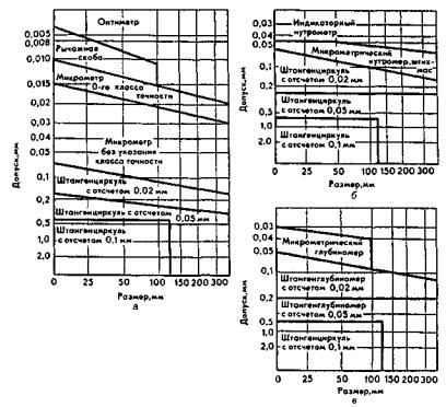 Измерительные и контрольные инструменты. В качестве измерительных инструментов при монтаже применяют штангенциркули, микрометры, нутромеры, угломеры, нивелиры, уровни, теодолиты, струны и др. Штангенциркули применяют для измерения наружных и внутренних диаметров, длины, толщины, глубины, высоты. Для определения дробной части интервала деления основной шкалы используется нониус. Согласно ГОСТ 166 штангенциркули выпускаются с диапазоном измерения от 0 до 2000 мм и величиной отсчета по нониусу 0,1 и 0,05 мм. Микрометры предназначены для измерения наружных размеров детали. Микрометры гладкие типа МК (ГОСТ 6507) выпускают первого и второго классов точности, с диапазоном измерения 0-600 мм и ценой деления шкалы барабана 0,01 мм. Для измерения толщины стенок труб с внутренним диаметром не менее 12 мм применяют трубный микрометр МТ (ГОСТ 6507). Рычажный зубомерный микрометр МРЗ (ГОСТ 4381) используют для измерения длины общей нормали зубчатых колес. Измерение среднего диаметра метрических и дюймовых резьб производят микрометром МВМ со вставками (ГОСТ 4380). Для измерения внутренних размеров детали применяют микрометрические нутромеры (ГОСТ 10), для контроля линейных размеров, отклонений формы и расположения при абсолютных и относительных измерениях - индикаторные нутромеры (ГОСТ 9244 и ГОСТ 868), для измерения углов - универсальные угломеры, оптические, которые выпускают по ГОСТ 11197, маятниковые ЗУ-РИ-М. Уровни (рис. 1.41) с разной ценой деления ампулы используют для контроля состояния поверхностей, а также при монтаже для проверки точности установки оборудования. Под ценой деления уровня понимают его наклон, соответствующий перемещению пузырька основной ампулы на одно деление шкалы в миллиметрах на 1 м, причем цене деления 0,01 мм/м соответствует угол наклона основания уровня 2". Рамные уровни (ГОСТ 9392) (рис. 1.41а) имеют корпус в виде квадрата и предназначены для контроля как горизонтального, так и вертикального расположения поверхностей. Брусковые уровни (ГОСТ 9382) (рис. 1.41б) предназначены для измерения малых отклонений поверхностей оборудования от горизонтальности. Удобны в применении брусковые уровни с микрометрической подачей ампулы (ГОСТ 1196) (рис. 1.41в), с помощью которой при любом положении основания уровня ампулы устанавливают в горизонтальном положении, а ее перемещение отсчитывают по микрометрической головке, что позволяет расширить диапазон измерения.