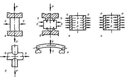 При установке рожковых зажимов их дужка должна располагаться со стороны короткого конуса петли каната. Гайки зажима затягиваются так, чтобы общая ширина стянутых канатов составляла 0,6 суммы первоначальных диаметров (канатов), что проверяют штангенциркулем. Момент затяжки следует контролировать динамометрическим ключом. В процессе эксплуатации затяжку стропов проверяют еженедельно и перед каждым ответственным подъемом. Достаточно надежным является крепление каната с помощью коуша с заливкой. При этом конец каната пропускают через стальной литой коуш-втулку, затем расплетают его на длине, равной двум длинам конуса. Вырезают органический сердечник, обезжиривают бензином или бензолом, протравляют соляной кислотой и промывают в горячей воде. Каждую проволоку сгибают пополам и втягивают конец каната в коуш. Затем коуш подогревают до 100°С и заливают легкоплавким сплавом с температурой плавления не более 360°С (например, баббитом). Получающееся соединение отличается целостностью и повышенной надежностью. Клиновые зажимы позволяют осуществлять быструю сборку и разборку соединений. Они надежны и удобны в работе. При угле наклона 1:4 и коэффициенте трения между элементами зажима и канатом 0,15 запас надежности удерживания каната равен примерно трем. Широко применяется и крепление конца каната опрессованием втулками, изготовленными из алюминиевых сплавов марок АДО, АД1, АД31, АМц и др. Овальную алюминиевую втулку (см. рис. 1.5г) надевают на предварительно очищенную ветвь каната, образующую петлю вокруг коуша, так, чтобы конец ветви каната выходил из втулки на 2-3 мм. Собранную заготовку помещают в матрицу и сдавливают пуансоном до получения круглого поперечного сечения втулки. Усилие опрессования зависит от диаметра каната и принимается по руководящему документу Р-10-33-93. Трудовые затраты при образовании петли на канате с помощью втулок в 5-6 раз меньше, чем при заплетке. Грузозахватные устройства и приспособления. Для захватывания и перемещения грузов применяют крюки, петли, клещевые захваты, стропы. Крюки по форме разделяют на однорогие (рис. 1.6 а, в) и двурогие (рис. 1.6 б, г). Их размеры стандартизированы: для механизмов с ручным и машинным приводом - однорогие крюки по ГОСТ 6627, для механизмов с машинным приводом - двурогие по ГОСТ 6628.
