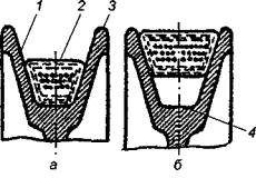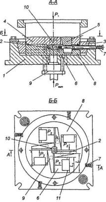 Рис. 4.23. Оснастка для восстановления крестовых ножей: При рабочем ходе пресса клинья перемещают горизонтальные пуансоны в направлении восстанавливаемого ножа. При деформации передней поверхности ножа металл перемещается в пустоты ручья матрицы и заполняет их. В момент окончания рабочего хода горизонтальных пуансонов и завершения формообразования передней режущей поверхности начинается деформирование скошенным выступом вертикального пуансона задней нерабочей поверхности ножа. В результате перераспределяемый металл окончательно заполняет выемки ручья матрицы. В штамповой оснастке наряду с восстановлением размеров режущих кромок происходит восстановление изношенной ступицы ножа за счет перемещения запаса металла с задней (нерабочей части) к изношенным участкам. После окончания процесса деформации вертикальный пуансон и клинья, закрепленные на траверсе пресса, отводятся, при этом горизонтальные пуансоны под действием пружин перемещаются до упора ограничителей в стенки матрицы, а затем поковка ножа удаляется из матрицы выталкивателем. Заключительным этапом технологии является механическая обработка штампованного ножа с последующими операциями закалки и низким отпуском. Неподвижные ножевые решетки изготавливают в виде дисков с круглыми отверстиями. Размеры решеток определяются параметрами мясорубки, на которой они функционируют, а конструкция - видом перерабатываемого продукта. Кромки отверстий решеток, режущие по всему своему периметру, и производят продольные круговые надрезы продукта. Качество измельчения зависит, прежде всего, от остроты режущих кромок отверстий. Их затупление (дефект 1) (рис. 4.24) приводит к увеличению усилий резания и энергозатрат, а качество резания продукта снижается. Поэтому плоскости решеток ежесменно затачивают до выведения следов завальцовки режущих кромок.