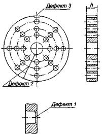 Рис. 4.24. Дефекты ножевой решетки промышленной мясорубки (h - толщина решетки) Так как обе плоскости ножевой решетки рабочие, в случае затупления режущих кромок одной плоскости возможна перестановка решетки. Попадание в измельчаемый продукт твердых включений увеличивает динамические нагрузки на решетку, что обуславливает возникновение трещин и приводит в дальнейшем к поломке решетки (дефект 2). Распространенным дефектом решетки является разбивка шпоночного паза (дефект 3). Наличие такого дефекта снижает качество резания и даже является причиной разрушения решетки. Работоспособность решеток восстанавливают шлифованием с последующей притиркой. Так как при работе ножевые решетки подвергаются интенсивному коррозионно-механическому изнашиванию, их при изготовлении упрочняют. К основным дефектам, образующимся в процессе эксплуатации ножей куттеров (рис. 4.25), относятся затупление и износ режущей кромки (дефект 1), образование сколов и трещин на лезвии (дефект 2), износ посадочного отверстия (дефект 3).