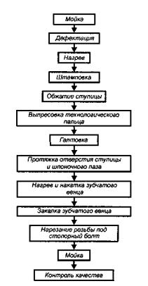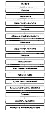 Рис. 4.26. Схема технологического процесса восстановления и упрочнения наконечников насосов типа 50-3Ц7, 1-20 Наконечники, поступающие в ремонт, очищают от грязи и жировых отложений с помощью моющих средств типа Лабомид-315 и Лабомид-102. Очищенные детали подвергают дефектации, затем проводят механическую обработку. Для получения требуемой шероховатости напыляемую поверхность подвергают абразивно-струйной обработке. Шероховатость поверхности после обработки должна быть Ra = 120-60 мкм. Газопламенное напыление проводят в два этапа: напыление подслоя горелкой "Искра-I" порошком ПТ-Ю5Н и напыление основного слоя горелкой "Искра-I" алюминиевым порошком САС-2. После напыления наконечника восстанавливаемую поверхность подвергают механической обработке на токарно-винторезном станке 16К20 с припуском под обработку напыленных поверхностей детали микродуговым оксидированием. Детали обезжиривают в водном растворе, содержащем 5-10 г/л NaOH, 40-50 г/л Na3PО4 и 3-5 г/л Na2SiО3, затем детали промывают в воде, после чего поверхности, не подлежащие упрочнению, изолируют. Подготовленные детали монтируют на подвеску и опускают в ванну с электролитом. Оксидирование осуществляют в электролите следующего состава: КОН - 2,8-3,2 г/л, Na2SiО3 - 5-7 г/л. После МДО детали снимают с подвески, промывают в проточной воде комнатной температуры, сушат и проводят финишную механическую обработку. Механическую обработку осуществляют на станке 3М150 при помощи эластичного абразивного инструмента, который состоит из лепестков абразивной шкурки, закрепленных между двумя дисками. При вращении инструмента обработка осуществляется периферийной частью лепестков шкурки. У ротационных насосов типа НРМ-2 износу подвергаются корпус, зубья ротора, набивка сальника, резьба шпилек крепления крышки к корпусу, а также полуда на деталях из бронзы. Преждевременный износ поверхностей деталей обычно обусловлен неправильной сборкой насоса (чрезмерная затяжка сальника, неравномерное прилегание крышки к корпусу (перекос), перекос ротора и др.). При несвоевременной подтяжке гайки сальника насос не будет работать на всасывание из-за подсоса воздуха через сальник. Изношенную набивку сальника заменяют. Отремонтированные бронзовые детали лудят. Основная доля отказов вентиляторов приходится на электродвигатели. У электродвигателей чаще всего повреждаются статор и ротор. У статора дефекты могут иметь станина, сердечник, обмотка. Станина по сравнению с другими деталями электродвигателя повреждается сравнительно редко. Дефект ее - излом лап, трещины, забоины, износ или срыв резьбы в отверстиях, забоины и заусенцы на посадочных местах под подшипниковые щиты. Срыв или износ резьбы можно устранить, установив спиральные резьбовые вставки или нарезав резьбу ремонтного размера, применяя при этом винты и болты большего размера. Забоины и заусенцы посадочных мест под подшипниковые щиты зачищают напильником. Изломы лап и трещины в станине электродвигателя устраняют сваркой при капитальном ремонте на специализированном ремонтном предприятии. Сердечник может иметь повреждение антикоррозионного покрытия, а также коррозионное разрушение на внутренней поверхности. Эти дефекты устраняют, зачищая участки, поврежденные коррозией, шлифовальной шкуркой до исчезновения следов коррозии и продувая сжатым воздухом. Зач