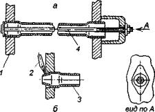 На арматуру наносят краску, показывающую материал корпуса, крышки и сальника. Если они изготовлены из углеродистой стали, то наносится краска серого цвета, из легированной - синего, из коррозионно-стойкой - голубого, из чугуна - черного. Арматура из цветных металлов не окрашивается. Окраска маховика, рычага и других приводных деталей указывает на материал уплотнительных поверхностей: бронза или латунь - красный цвет, коррозионно-стойкая сталь - голубой, баббит - желтый, полиэтилен - серый с красными полосками по периметру. К вспомогательным материалам, применяемым при монтаже, относятся болты, гайки, шайбы, прокладочные и набивные, обтирочные и абразивные материалы. Для крепления оборудования, работающего со статистическими и незначительными динамическими нагрузками, применяют самоанкерующиеся болты первого и второго типов (рис. 1.44).