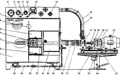 Рис. 2.9. Насос 36МЦ10-20 (36МЦ6-12): При ТО-1, кроме операций ЕТО, разбирают насос и заменяют изношенные детали. У ленточного транспортера до начала работы проверяют исправность заземления электродвигателей, пусковых устройств, всех сборочных единиц транспортера, тормозов передвижной разгрузочной тележки, наличие ограждений, натяжение ленты. После обкатки вхолостую транспортер испытывают под нагрузкой. Груз подается только после разгона ленты до нормальной скорости, останавливают транспортер только после освобождения ленты от груза. Необходимо следить, чтобы лента при движении опиралась на все роликовые опоры. Натяжная станция должна автоматически поддерживать натяжение в зависимости от массы груза. При обслуживании транспортеров следят, чтобы во время работы лента не смещалась в сторону, в результате чего снижается производительность и увеличивается расход энергии. Буксования ленты конвейера не допускают, так как это вызывает повышенный расход электроэнергия, преждевременный износ ленты, а при длительном буксовании лента может загореться и вызвать пожар. При осмотре ленточных транспортеров проверяют натяжение ленты, наличие смазки в подшипниках, состояние втулок муфт, зубчатых колес редукторов, крепежных деталей. При необходимости натяжение ленты регулируют и смазывают ее. При обслуживании нории выполняют следующие требования. Норийные трубы, башмаки, колпаки головок и смотровые люки в сварных соединениях должны быть герметичными, не пропускать пыль и зерно, в случае обнаружения неисправностей их необходимо устранить. При необходимости расчистки башмака нории от завала рабочий должен убедиться в том, что привод нории выключен, поставлен на тормоз, исключена возможность обратного хода. Чистить башмак нории от продукта нужно только специальным скребком с гладкой ручкой. При этом следует быть особенно осторожным, чтобы в случае непроизвольного обратного хода норийной ленты ковшами не захватило руки. После ликвидации завала нории надо выявить его причины и принять меры к его устранению (слабо закрепленные и оторванные ковши, слабое натяжение ленты, нарушение ее центровки и т.п.). У роликового элеватора Г6-ФЭР периодически наблюдают за натяжением цепи и при необходимости регулируют. При чрезмерном вытягивании цепи удаляют два звена, а натяжение регулируют вновь. Не реже одного раза в год цепь с ведущими упорами тщательно очищают и промывают в керосине, после чего осматривают все изнашивающиеся детали. Изношенные пальцы, пластины и другие детали заменяют новыми или восстановленными. Не реже одного раза в месяц цепь с ведущими упорами и места смазки звездочек смазывают солидолом жировым УС-1. Уровень масла в мотор-редукторе проверяют по рискам на стержне маслоуказателя. Марка масла, порядок его замены предусмотрены согласно паспорту и руководству по эксплуатации на мотор-редуктор. При эксплуатации элеватора периодически проверяют заземлена. В конце каждой смены производят санитарную обработку элеватора. При ежесменном осмотре стола конвейерного К7-ФН1-А проверяют натяжение ремней, цепей и транспортной ленты, уровень масла в редукторах, надежность заземления, выявляют детали, требующие замены при ближайшем плановом ремонте, с соответствующей записью в ведомости дефектов. При профилактическом осмотре стола пр