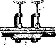 Рис. 4.43. Приспособление для сборки и стяжки труб: Для соединения труб применяют короткую и длинную резьбы. При короткой резьбе получают соединение, разъединить которое можно, только разрезав трубу. Соединение на длинной резьбе, называемой сгоном, можно разъединить без разрезки трубы - путем сгона контргайки и муфты в сторону длинной резьбы. В качестве уплотнений резьбовых соединений используют льняную прядь и суриковую жидкую мастику. Широко применяют фланцы для соединения труб. Для соединения полиэтиленовых труб применяют сварку с помощью газопламенного нагревателя, а также муфты и склеивание. Внутренний водопровод после ремонта подвергают гидравлическому испытанию по правилам и требованиям, предъявляемым к монтажу нового водопровода. Если при ремонте был заменен небольшой участок труб, то вместо гидравлического испытания проводят проверку отремонтированного участка водопровода на утечку воды и герметичность сварных швов под рабочим давлением сети. После испытания водопровод дезинфицируют раствором хлорной извести и промывают водой до полного удаления запаха хлора. Для дезинфекции обычно используют растворы с концентрацией активного хлора 75-100 мг/дм при контакте 5-6 ч и 40-50 мг/дм3 при контакте до 24 ч. Хлорный раствор приготавливают на месте в деревянной бочке, куда засыпают измеренное количество хлорной извести, разбавляют водой и тщательно перемешивают. По окончании времени контакта хлорную воду спускают в место, указанное санитарно-эпидемиологической службой. Наружная поверхность стальных и чугунных трубопроводов подвергается коррозии. Для предохранения от этого их после ремонта покрывают изоляцией, процесс нанесения которой состоит из очистки поверхности труб, грунтовки и накладки изоляции. Очистку труб производят вручную или с использованием шлифовальных механизмов. Поверхность очищают от грязи, ржавчины и окалины до металлического блеска. В качестве грунта обычно используют раствор битума в трех частях бензина. Раствор готовят следующим образом: разогревают битум до жидкого состояния в котле, затем наливают его в бак и дают остыть до температуры 70-80°С. После остывания его осторожно вливают в емкость с бензином и непрерывно перемешивают деревянной мешалкой до полного растворения битума. Грунтовку наносят ровным слоем толщиной 0,1-0,2 мм без подтеков, сгустков и пропусков сразу после очистки труб. После высыхания грунтовки укладывают битумное изоляционное покрытие, которое готовят из битума и наполнителя. Укладку выполняют вручную или с помощью специальной машины. Арматура. При ремонте арматуры приходится устранять неисправности кранов, задвижек, вентилей, клапанов. Наиболее характерные дефекты кранов - трещины и пробоины в стенках корпуса, износ или срыв резьбы, износ сопряженных трущихся деталей корпуса и пробки, износ или повреждение сальниковых уплотнений. Трещины, изломы и пробоины в корпусе крана заваривают. Изношенные посадочные места под пробку в корпусе растачивают и шлифуют, изношенный конус пробки протачивают на токарном станке. Образованные конусные поверхности пробки и отверстия притирают, используя абразивные микропорошки, и притирочные пасты. После притирки поверхности доводят специальными пастами. Притирают поверхности вручную или с помощью приспособлений. Качество притир