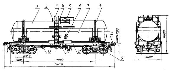 Рис. 4.7. Четырехосная цистерна для олеума с тормозной площадкой модели 15-Ц857
