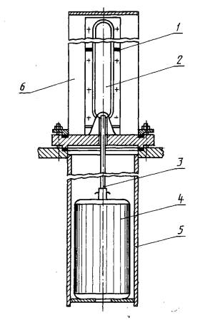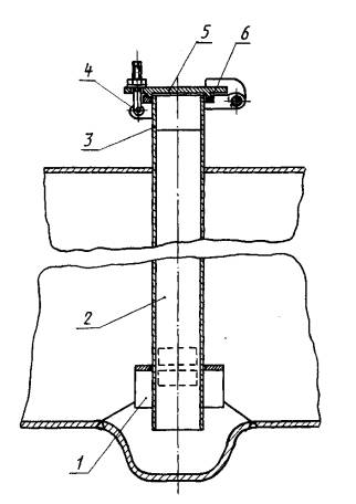 Рис. 5.17. Четырехосная цистерна для винилхлорида модели 15-1421 6. ЦИСТЕРНЫ ДЛЯ КИСЛОТ И ЖИДКИХ ХИМИЧЕСКИХ ПРОДУКТОВ6.1. ТИПОВЫЕ ЭЛЕМЕНТЫ КОНСТРУКЦИИК этой группе относятся цистерны, предназначенные для перевозки агрессивных химических жидкостей, не требующих подогрева при сливоналивных операциях и сохраняющих жидкое состояние в диапазоне климатических колебаний температуры. Некоторые из этих жидкостей (ацетальдегид) не допускают контакта с кислородом воздуха и их пары могут образовать с ним взрывоопасную смесь. Налив и слив таких продуктов производится закрытым способом передавливанием азотом или инертным газом или сифонированием с заполнением освобождающегося объема цистерны азотом или газовой фазой продукта. К характерным для данной группы частично унифицированным элементам относятся сливоналивные устройства, контрольные устройства (пробоотборное и контроля наполнения и слива), предохранительно-впускной клапан. В нижней части котла под сливоналивным устройством располагается штампованный поддон, обеспечивающий полноту слива продукта, а при необходимости - отстоя. Нижний лист имеет уклон к поддону. Для фиксации сливоналивных, зачистных и пробоотборных труб для нижней пробы к нижнему листу сваркой крепится скоба, расположенная непосредственно над поддоном. Сливоналивное устройство (рис. 6.1, 6.2) состоит из сливоналивной трубы 1, нижний конец которой доходит до поддона. На верхнем конце трубы снаружи котла устанавливается вентиль 2 (см. рис. 6.1) или присоединительный фланец 2 с крышкой 3 (см. рис. 6.2). В некоторых случаях сливоналивное устройство оборудуется зачистной трубой 5 (см. рис. 6.1) для слива отстоя или остатков продукта с вентилем 4, соединенным наружной трубкой 3 со сливным патрубком жидкостного вентиля 2 или дополнительной внешней магистралью. Пробоотборное устройство состоит из системы труб, нижние концы которых погружены в перевозимый продукт на разную глубину (для взятия верхней, средней и нижней пробы), а на верхних концах установлены вентили с присоединительными патрубками (рис. 6.3). В некоторых конструкциях предусмотрено взятие проб открытым способом через пробоотборный люк. Устройства контроля уровня наполнения и слива выполняются в виде системы труб с вентилями, нижние концы которых располагаются на контролируемом уровне в котле, а указателем достижения уровня наполнения является поступление продукта через открытый вентиль. Для ядовитых и наиболее опасных продуктов применяется поплавковый указатель уровня наполнения закрытого типа (рис. 6.4), состоящий из поплавковой камеры 5, поплавка 4 со штоком 3 и стеклянного индикатора 2 с контрольной меткой 1, заключенного в металлический сборный корпус 6. Предохранительно-впускной клапан кислотных цистерн (см. рис. 4.3) регулируется на избыточное давление 0,2-0,25 МПа (2-2,5 кгс/см2) и вакуум 0,03 МПа (0,3 кгс/см2). Цистерны, предназначенные для перевозки продуктов, пары которых образуют с воздухом взрывоопасную смесь, оборудуются только предохранительным клапаном избыточного давления. Все присоединительные фланцы и патрубки в транспортном положении закрываются заглушками. Для уплотнения разъемных соединений применяются прокладки из фторопласта. Основные параметры цистерн для кислот и жидких химических веществ приведены в табл. 6.1. 6.2. ЦИСТЕРНЫ ДЛЯ СЕРНОЙ КИСЛОТЫДля п