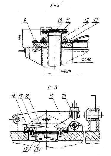 Рис. 4.19. Четырехосная цистерна для жидкого пека модели 15 -15 32 Основные параметры цистерны для пека приведены в табл. 4.2. Жидкий пек выделяет пары, которые, соединяясь с воздухом, образуют горючие смеси, могущие легко воспламеняться от любой искры, нагретых поверхностей и др. Кроме того, пары пека могут вызвать отравление. Попадая на кожу человека, жидкий пек может вызвать ожоги. Отравления и ожоги может вызвать и пыль пека. При солнечном свете токсичные действия пека проявляются сильнее, чем в темноте. Каменноугольный пек - токсичное вещество, поэтому при техническом обслуживании и эксплуатации цистерн для пека должны строжайше соблюдаться правила техники безопасности. Цистерна для перевозки пека (см. рис. 4.19) имеет следующие узлы: котел 3, раму с настилом 9, автотормоз 12, тележки 11, автосцепное оборудование 10, изоляцию котла 4, крепление котла на раме 6, наружную лестницу с помостами 2, кожух электронагревателей 5, каркас и (кожух изоляции 7, электрооборудование 8, теплоизоляционную крышку горловины 1, стояночный тормоз 14, панельный ящик 13. Котел состоит из цилиндрической обечайки и двух эллиптических днищ и выполнен из низколегированной стали марки 09Г2С-12. Для более полного слива продукта нижний лист котла имеет с двух сторон уклон к поддону, в котором опущена сливная труба. Налив и слив продукта - верхние. Для этого в середине верхней части котла приварена горловина люка-лаза диаметром 624 мм с крышкой 2 (рис. 4.20), на которой установлены сливная 3, наливная 4 трубы. На крышке также устанавливаются смотровой люк 1 и быстрооткрывающаяся крышка ригельного типа 5 вспомогательного люка-лаза диаметром 400 мм, на которой в свою очередь находятся штуцер 7 и муфтовый кран 8. Сливная труба Dy 100 (см. рис. 4.20, Б-Б) служит для слива продукта. Ее устанавливают по центру котла над поддоном на расстоянии 90 мм от него. Сливная труба 12 при помощи фланца 13 крепится шпильками 9 к крышке 2 (см. рис. 4.20) основного люка-лаза, сверху она плотно закрывается заглушкой 10 с хомутами 11. Наливная труба (см. рис. 4.20, А-А) служит для налива продукта в котел, по конструкции она аналогична сливной трубе. Смотровой люк предназначен для определения уровня налива продукта в котел, которое производится либо визуально, либо с помощью деревянной рейки с делениями. В случае необходимости замера температуры продукта в котле термопара устанавливается в смотровой люк. Смотровой люк закрывается крышкой с предохранительной мембраной 15 (см. рис. 4.20, В-В), которая защищает котел от избыточного свыше 0,2 МПа (2кгс/см2) давления в нем. Предохранительная мембрана со стороны продукта защищена фторопластовой пленкой толщиной 0,15 мм и отражателем 14, а сверху экраном 18. Мембрана с пленкой зажаты между фланцами 16 и 17. Крышка люка закрывается ригелем 19 и откидным болтом 20. Защитная пленка мембраны должна разрушаться от вакуума свыше 0,04-0,06 МПа (0,4-0,6 кгс/см2) и температуры среды 100° С в цистерне. Вспомогательный люк-лаз служит для наполнения котла продуктом с помощью иглы заливного устройства установок автоматического налива, имеющихся на некоторых заводах, а .также для доступа в котел в случае необходимости (техническое освидетельствование, осмотр, определение качества слива, пропарки, наличия осадков и др.). Крышка вспомогательного люка-лаза имеет предохранительную скобу 6 (см. рис. 4.20), которая исключает открытие 