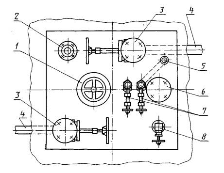 Рис. 4.34. Сливоналивная и контрольно-измерительная арматура цистерны модели 15-1552: 1 - предохранительно-впускной клапан; 2 - крышка люка; 3 - манометродержатель; 4 - вентиль Dу 25 пробоотборника; 5 - сливоналивной вентиль Dу 80; 6 - смотровой люк; 7 - газовый вентиль Dу 25; 8 - фланец патрубка теплоносителя 4.2.6. Цистерны для бензолаОбщий вид цистерны для перевозки бензола модели 15-1527 показан на рис. 4.35. Эта цистерна по конструктивному исполнению котла, термоизоляции и системы разогрева аналогична цистерне для перевозки пасты сульфонола модели 15-1417 (рис. 4.28), описанной выше. Котел цистерны для бензола изготовлен из стали марки 09Г2С-12. Способ налива и слива - верхний передавливанием или откачиванием вакуум-насосом. Подогрев продукта осуществляется паром или горячей водой через змеевик, расположенный внутри котла в нижней его части. Операции по разогреву продукта аналогичны, как у цистерны модели 15-1417. Теплоизоляция имеет толщину 90 мм. Допускаемая температура продукта при наливе +20 °С; при сливе +25 °С. 4.2.7. Цистерны для суперфосфорной кислотыОбщий вид цистерны для суперфосфорной кислоты модели 15-889 показан на рис. 4.36. Цистерна имеет котел из стали повышенной прочности марки TTST52, изготовленный в ФРГ. Цистерна модели 15-1578 (рис. 4.37) имеет котел из стали марки ZINCDU 25-20 (УРАНУСБ), изготовленный во Франции. Котел изолирован пенополиуретаном и обшит листовой сталью толщиной 1 мм. Котел располагается в каркасе кожуха - специальном несущем элементе, аналогичном броневому листу восьмиосных цистерн, но имеющему подкрепления в виде элементов шпангоута: Концевые части этого несущего элемента имеют полурамы и защитные щиты. В верхней части котла имеется люк со сливоналивной арматурой и два технологических люка-лаза. Все люки закрыты теплоизолирующими крышками. В среднем люке установлена сливоналивная труба с быстросъемной крышкой, комбинированный предохранительный клапан, патрубок с кулачковой муфтой для соединения с уровнемером. В нижней части котла установлено разгрузочное устройство для нижнего слива продукта (рис. 4.38). На одном конце вагона расположены штуцеры для подключения системы разогрева к внешнему источнику пара. Система разогрева состоит из труб, расположенных вдоль котла вагона. Температура пара должна быть не выше 120 °С при давлении 0,1 МПа (1 кгс/см2). Для наполнения цистерны необходимо: а) затормозить поданную к пункту налива цистерну; б) провентилировать котел, отсоединив кулачковую муфту на пневмоштуцере; в) рукоятку предохранительного клапана установить в положение "Вентиляция" и снять крышку сливоналивной трубы; г) подсоединить к сливоналивной трубе наполняющий трубопровод с помощью быстросъемного соединения; д) подсоединить уровнемер к кулачковой муфте пневмоштуцера; е) открыть кран и наполнить котел не более чем на 98 % емкости. По окончании наполнения отсоединить наполняющий трубопровод, удалить пролившиеся остатки продукта, закрыть крышкой сливоналивную трубу, установить предохранительный клапан в рабочее положение, плотно закрыть крышку люка. Слив продукта осуществляется в следующей последовательности: а) поданную к пункту слива цистерну затормозить ручным тормозом; б) открыть крышку люка, снять кулачковую муфту с пневмоштуцера, а при пневмовыгрузке - подсоединить воздушную магистраль; в) измерить температуру продукта, подключив 