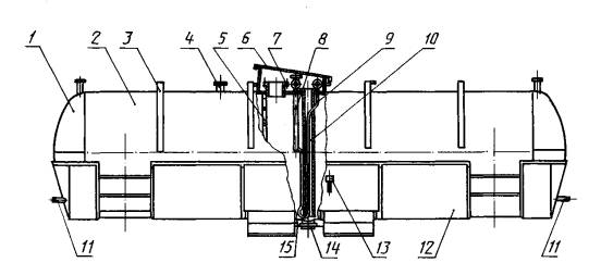 Рис. 4.2. Котел цистерны для олеума модели 15-1424: 1 - обечайка; 2 - днище; 3 - патрубок для предохранительно-впускного клапана; 4 - сливоналивной патрубок; 5 - штуцер под манометродержатель; 6 - патрубок для отвода газа при наливе; 7 - крышка люка-лаза; 8 - патрубок для подвода воздуха при сливе; 9 - поддон; 10 - подогревательный кожух; 11 - воронка для подвода пара; 12 - трубка для отвода конденсата