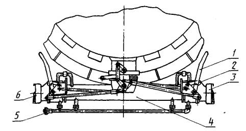 Рис. 4.38. Разгрузочное устройство цистерны модели 15-889: 1 - рукоятка для открывания сливного клапана; 2 - защелка; 3 - быстросъемное соединение сливного патрубка; 4 - обогревательный кожух сливных патрубков; 5 - муфта для слива теплоносителя; 6 - крышка сливного патрубка 4.2.8. Цистерны для амилаАмил является едкой жидкостью. Цистерны для амила принадлежат грузоотправителю или грузополучателю и должны следовать как в груженом, так и в порожнем состояниях в сопровождении бригады (грузоотправителя и грузополучателя). Для перевозки и временного хранения (до 1 месяца) амила предназначены четырехосные цистерны модели 15-1576 (ЖАЦ-44) (рис. 4.39). Основные параметры этой цистерны приведены в табл. 4.2. Цистерна состоит из следующих основных узлов: котел с каркасом 5, типовая платформа 8 с двумя двухосными тележками ЦНИИ-ХЗ на роликовых подшипниках 9, изоляция котла 6, кожух изоляции 7, крепление 10 котла на раме, наружная лестница с помостами 4, внутренняя лестница. Котел 1 цистерны (рис. 4.40) имеет цилиндрическую обечайку из сваренных продольных листов (нижнего толщиной 10 мм, средних и верхних толщиной 8 мм) с внутренним диаметром 2417 мм и два эллиптических днища (толщиной 12 мм). Для нагрева или охлаждения продукта на котле снаружи приварен теплообменник 9, который представляет собой выполненный из холодногнутых угольников змеевик. Котел и теплообменник изготовлены из кислотостойкой стали марки 08Х18Н10Т. Подвод горячей (или холодной) воды к теплообменнику и слив ее осуществляется при помощи труб 16, 17, выведенных наружу цистерны (за кожух изоляции) и заканчивающихся патрубками с соединительными головками ГМ-50 (типа пожарных рукавов). На котле с помощью кронштейнов, стекловолокнитовых прокладок и винтов крепится шесть опорных колец 20 для установки кожуха теплоизоляции. К нижнему листу котла привариваются четыре лапы 14 для крепления котла к раме, а также поддон 15, к которому для полного слива продукта имеется двусторонний уклон. Внутрь поддона вводятся: сливоналивная труба 11, зачистная труба 12 (для слива остатков продуктов из котла) и труба для отбора проб из отстойника. Здесь же располагается направляющая 13, предотвращающая смещение и поломку труб при гидроударе и образование гидрозавихрений при сливе продукта насосом. Сливоналивная и зачистная трубы в верхней части цистерны выведены в арматурный люк и кончаются фланцами для крепления вентилей Dy 100 и Dy 25. Наверху котла устанавливаются (см. рис. 4.39) технологический 2 и арматурный 3 люки, предохранительно-впускной клапан 1. Вся поверхность котла снаружи покрывается изоляционными матами, которые и составляют его тепловую изоляцию. Маты состоят из изоляционного материала АТИМСЕ-30, пришитого к стеклоткани стеклонитью. Вся изоляция цилиндрической части котла для предотвращения выпучин и провисания изоляционных матов обматывается по спирали капроновой нитью с шагом между витками 200-250 мм. Толщина изоляции 190-200 мм. Поверхность изоляции представляет сплошной покров из двух слоев стеклоткани, покрытых для предотвращения проникновения влаги и паров продукта в термоизоляцию тремя слоями лака ХСЛ. Сверху изоляция защищена от механических повреждений кожухом изоляции из нержавеющей стали. Котёл с изоляцией устанавливается на опорах платформы и крепится от продольного смещения 56 болтами, связывающими лапы котла с л