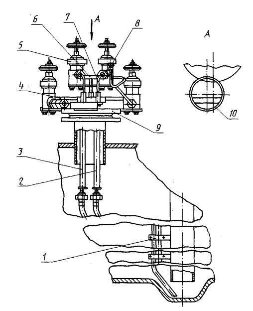 Рис. 4.43. Пробоотборное устройство: 1 - хомут; 2 - заборная труба; 3 - донная труба; 4 - коллектор; 5 - сильфонный вентиль Dу 6; 6 - коллектор; 7 - соединительная труба; 5 - штуцер; 9 - фланец; 10 - подставка Для работы в котле выделяется не менее трех человек: двое поочередно работают внутри котла, третий (наиболее опытный) наблюдает за работой в люке-лазе. Работы в котле производятся в спецодежде после его нейтрализации. Человек, который спускается внутрь котла, обязан надеть специальный пояс с крестообразными лямками и прочной сигнально-спасательной веревкой, а также противогаз типа ПШ-1 (ПШ-2). Наружный конец дыхательного шланга крепится в зоне чистого воздуха. Около цистерны должны находиться аптечка и запасной дыхательный прибор. При выполнении работ по сливу и наливу амила запорные устройства во избежание гидравлических ударов надо открывать плавно. Запрещается при перекачке амила без надобности находиться в непосредственной близости от напорных патрубков насосов, напорных трубопроводов и шлангов. Оборудование (в случае попадания на него амила) обильно промывается водой, затем нейтрализуется 5-10 %-ным раствором каустической или кальцинированной соды и еще раз промывается водой. Пролитый на землю амил нейтрализуется раствором гашеной извести или 5-10 %-ным раствором каустической или кальцинированной соды, затем участок должен быть перекопан. На 1 литр амила необходимо около 30 литров нейтрализирующего раствора. Имеющие контакт с амилом средства защиты обильно промываются водой и сушатся. Запрещается: 1) производить какие-либо работы на цистерне замасленными руками, в замасленной спецодежде, пользоваться замасленным инструментом; 2) при освещении пользоваться открытым огнем. Осветительные приборы должны быть во взрывозащищенном исполнении; 3) до отключения и заземления проводов контактной сети на электрифицированных участках проводить работы наверху цистерны. В исключительных случаях допускается работа на площадках цистерны, не поднимаясь над уровнем люков. Перед вскрытием люка-лаза или отсоединением арматуры и приборов необходимо убедиться по манометру в отсутствии в котле давления. При подготовке новой цистерны к работе или после консервации, или ремонта без замены отдельных узлов вагона необходимо выполнить следующие операции: 1) проверить комплектность цистерны согласно формуляру и ведомости ЗИП; 2) если цистерна законсервирована, то расконсервировать ее; 3) проверить состояние цистерны (очистить от пыли и грязи; осмотреть наружные поверхности цистерны; места, пораженные коррозией, зачистить стальными щетками, загрунтовать, закрасить; протереть и проверить наружные поверхности арматуры; проверить работоспособность вентилей, открывая и закрывая их: рукоятки должны вращаться плавно, без заеданий: проверить крепление котла цистерны (затяжку гаек и стяжных хомутов) и, при необходимости, подтянуть; проверить надежность затяжки болтов фланцевых соединений и подтянуть в случае необходимости; проверить наличие заглушек на концевых патрубках; проверить тормозное оборудование по инструкции ЦВ МПС, а также автосцепки и ходовые части цистерны (производится специалистами МПС); проверить работоспособность электротермометра ЭТ-3Б); 4) проверить работоспособность предохранительно-впускного клапана, приборов и, при необходимости, 