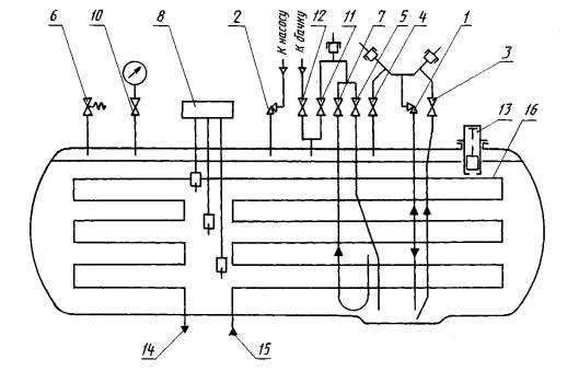 Рис. 4.44. Принципиальная комбинированная схема цистерны для амила модели 15-1576: 1 - вентиль Dy100; 2 - вентиль Dy 70; 3 - вентиль Dy 25; 4 - вентиль Dy 25; 5, 7, 11, 12 - вентили Dy 6; 6 - предохранительно-впускной клапан; 8 -электротермометр; 10 - манометродержатель; 13 - указатель окончания наполнения; 14, 15 - подвод жидкости к теплообменнику; 16 - теплообменник