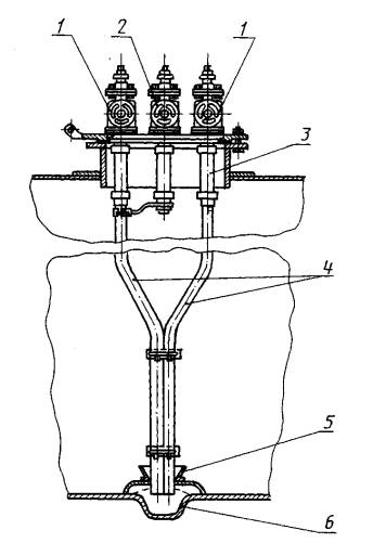 Рис. 4.23. Электрическая схема соединения электрооборудования цистерны для пека модели 15-1532 Каждая группа электронагревателей имеет номинальную мощность 30 кВт. Суммарная мощность всех нагревателей составляет 90 кВт. С помощью этих нагревателей воздух между котлом и термоизоляцией разогревается до 300 - 350 °С. На электрической схеме (см. рис. 4.23) приняты следующие обозначения: А1-1 - первая буква и цифра А1 - фаза цепи; вторая цифра "1" - номер участка цепи; отдельные номера 1, 2, 3 и 4 - проводники цепи управления. В соответствии с этими обозначениями имеют маркировку все проводники на цистерне. Напив продукта в цистерну производится в следующей последовательности: 1) цистерна затормаживается стояночным тормозом и тщательно осматривается; дается письменное заключение об исправности узлов и готовности цистерны к наливу; 2) вагон заземляется путем подсоединения к ушку заземления гибкого проводника с наконечником под болт M12; 3) для налива через наливную трубу необходимо: а) открыть теплоизоляционную крышку горловины; б) снять заглушку с наливной трубы; в) подсоединить к наливной трубе загрузочный трубопровод, оборудованный подсоединительным фланцем (рис. 4.24); 4) с помощью сигнализатора уровня СУУЭ-ЖЦ-2 (рис. 4.25), где 1 - ультразвуковой сигнализатор, стационарно установленный на пункте налива; 2 - гибкий шланг; 3 - датчик, устанавливаемый на котле перед наливом продукта; 4 - колокол, устанавливаемый в котле на глубине 652 мм (от верхней кромки фланца сливной трубы) или деревянного метрштока длиной не менее 3 мм (через смотровой люк) контролируется уровень наполнения котла. Выходящий из котла воздух и пары продукта должны отводиться по трубопроводу от крана Dy 32 в установленное место. Недолив до верхней образующей котла при заполнении жидким пеком с удельным весом 1,16 т/м3 и температурой 250°С составляет 220 мм; 5) после наполнения котла цистерны жидким пеком отсоединяется загрузочный трубопровод, воздушные шланги (или выводится игла заливочного устройства установки автоматического налива), закрываются крышки наливной трубы и смотрового люка, а также кран Dy 32 на крышке вспомогательного люка-лаза и изоляционная крышка горловины, отсоединяется заземление цистерны; 6) опломбируется теплоизоляционная крышка горловины и панельный ящик; 7) цистерна сдается представителю транспорта и отправляется в путь. Слив продукта из цистерны производится в следующей последовательности: 1) цистерна затормаживается стояночным тормозом и тщательно осматривается, проверяется отсутствие повреждений на раме, кожухе изоляции, устройстве слива продукта, целостность пломб, отсутствие давления внутри котла (открывается кран Dy 32), производится замер температуры продукта в котле и определяется необходимость разогрева пека; 2) вагон заземляется; 3) производится слив передавливанием или перекачиванием. Слив передавливанием осуществляется следующим образом: к сливной трубе подсоединяется магистральный трубопровод, а к крану Dy 32 - шланг от паропровода. Остальные патрубки и люки должны быть закрыты герметично. Через кран Dy 32 под давлением не более 0,065 МПа (0,65 кгс/см2) подается пар. Контроль за величиной давления осуществляется манометром, который устанавливается на пункте слива в цепь паропровода. Окончив слив, перекрывают подачу пара в котел цистерны, убедившись по манометру в отс