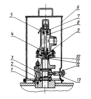 Рис. 5.5. Предохранительный узел с разрушаемой диафрагмой цистерны модели 15-1556: 1 - пломба; 2 - кольцо; 3, 4, 5 - втулки; 6 - колпак; 7 - винт; 8 - пружина; 9 - прокладка; 10 - седло клапана; 11 - клапан; 12 - разрушаемая мембрана; 13 - вентиль ТУ 14-3-891-83