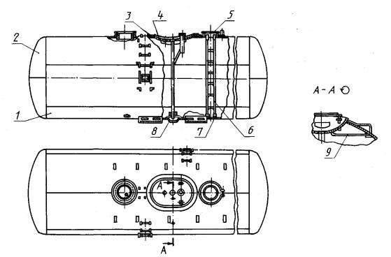 Рис. 4.17. Установка сливоналивной и контрольно-измерительной арматуры на цистерне модели 15-1525: 1 - прокладка; 2, 3 - патрубки; 4 - крышка люка; 5 - люк; 6 - заглушка; 7 - штуцер под манометр; 8 - патрубок; 9 - предохранительно-впускной клапан