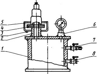 Рис. 6.25. Котел цистерны модели 15-1570 В верхней части котла устанавливается также крышка с арматурой 2 (рис. 6.26), которая представляет собой фланец, на котором размещены предохранительно-впускной клапан 3, пробоотборное устройство 5, манометродержатель 4 и заглушка 1. Устройство для налива и слива продукта цистерны модели 15--1416 (ЖГЦ-60) имеет типовую конструкцию, показанную на рис. 6.1, у цистерны модели 15-1570 (ЖГЦ-73) - конструкцию, приведенную на рис. 6.27. На этом рисунке: 1 - угловой вентиль Dy 15 вместе с трубой 5 служит для полного слива продукта; 2 - вентиль Dy 100 вместе с трубой 6 - для налива и слива продукта; 3 - угловой вентиль Dy 15 предназначен для продувки рукавов; 4 - патрубок. На цистернах для гептила применяются типовые поплавковые указатели уровня наполнения закрытого типа (см. рис. 6.4), описание которых дано в разд. 6.1. На цистерне модели 15-1570 (ЖГЦ-73) окончательный уровень наполнения продуктом (с плотностью 0,8 кг/дм3) котла цистерны соответствует отметке на шкале 265,5 см, при этом объем составит 68,05 м3. Во избежание образования взрывоопасной смеси пространство над продуктом заполняется азотом. Дня поступления азота в котел или удаления его из котла служит газовый вентиль Dy 70 (7 на рис. 6.27). Предохранительно-впускной клапан (защищающий от избыточного давления и вакуума в котле) у цистерн для гептила имеет в комплекте специальные приспособления (рис. 6.28 и 6.29), предназначенные для проверки работоспособности и регулировки предохранительно-впускного клапана в соответствии с требованиями „Технического описания и инструкции по эксплуатации 1416.09.0001 ПС". Для отбора проб продукта перед сливом служит пробоотборное устройство (см. рис. 6.3) типовой конструкции. На маховиках вентилей Dy 6 имеются трафареты, указывающие зоны котла (внизу, в средней части или наверху), откуда берется проба, а также направление вращения маховика. Трубы пробоотборного устройства ввариваются во фланец, укрепленный шпильками и гайками М12 на крышке арматурного люка. На одной из концевых балок рамы цистерны устанавливается ящик ЗИПа, в котором хранятся запасные части, инструмент, принадлежности и материалы, необходимые для нормальной эксплуатации и ремонта цистерны. Перечень единиц хранения ЗИПа устанавливается ведомостью 1570.00.000 ЗИ, которая входит в комплект эксплуатационных документов 1570.00.000 ЭД. Если необходимо в ЗИПе найти деталь (или какой-то узел), то в техническом описании цистерны находят рисунок сборочной единицы, куда входит деталь (или узел) и определяют обозначение детали (или узла). Затем по обозначению и по ведомости ЗИПа определяют: входит ли деталь в ЗИП и где она уложена. Упомянутые выше два приспособления для предохранительно-впускного клапана также хранятся в ящике ЗИПа. Приспособление № 1 (см. рис. 6.28) служит для проверки работы клапана при избыточном давлении. Оно включает в себя уравнительный бачок 1, куда через вентиль 7 подается воздух, патрубок 2 с тарелкой 5 для налива воды, штуцер 6 для установки манометра, вентиль 8 для сброса избыточного давления в уравнительном бачке, пробку 3 для слива воды из тарелки и прокладку 4, с помощью которой предохранительно-впускной клапан герметично устанавливается на фланец патрубка 2. При проверке клапана на избыточное давление в тарелку наливается вода до уровня, закрывающего отверстия для пропуска воздуха в корпус клапана. В ура