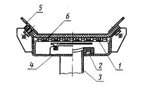 Котел цистерны (рис. 7.2) состоит из сваренных встык двух цилиндрических обечаек 1 и 2 и двух эллиптических днищ. Внутри котла для аэрации груза размещены четыре длинных аэролотка 8, четыре коротких аэролотка 6 и четыре аэроплитки 7. Аэролоток (рис. 7.3) представляет собой штампованный из листовой стали корпус 4, который сверху перекрыт пористой перегородкой 6, изготовленной в виде восьмислойного хлопчатобумажного непропитанного ремня. Для предотвращения провисания пористой перегородки от действия веса груза между этой перегородкой и корпусом аэролотка уложен П-образный лист 1 со специальными просечками. Эти просечки в листе служат для обеспечения равномерной подачи воздуха по всей поверхности пористой перегородки. Крепление пористой перегородки к корпусу аэролотка производится планками 5. Около днища аэролотки прикреплены к откосу и рассекателю торцовыми планками. В средней части аэролоток крепится к котлу патрубком 3 подвода воздуха, контргайкой и прижимной шайбой. Герметичность соединения обеспечивает резиновая прокладка 2. Аэроплитка 7 (см. рис. 7.2) состоит из штампованного корпуса прямоугольной формы, к которому прикреплена пористая перегородка. Аэролоток 8 крепится к котлу около днищ кронштейнами 9, в средней части трубы подвода воздуха - контргайкой 10. Аэролотки 6 и аэроплитки 7 крепятся к котлу в месте выхода патрубка подвода воздуха контргайками. Чтобы усилить перетекание порошкообразных грузов на пористые поверхности аэролотков, котел внутри оборудован откосами 14 и рассекателями 16, которые крепятся к диафрагмам 15. Откосы и рассекатели изготовляются из листовой стали ВСт3сп5 толщиной 4 мм. Котел имеет сообщающую трубу 11, оборудованную муфтовым краном 12 для понижения давления воздуха в котле. На листе откоса около подсоединения сообщающей трубы к подоткосной полости имеется смотровой люк 13, закрытый крышкой с резиновым уплотнением. Слив конденсата из подоткосной полости осуществляется через штуцер 4, закрытый пробкой. Котел оборудован двумя разгрузочными патрубками 5. Разгрузочное устройство (рис. 7.4) состоит из дроссельной заслонки 1, выгрузочного патрубка 2 и трубы поддува 4. Дроссельная заслонка крепится шестью болтами М16×130 и состоит из металлического корпуса, резинового кольца, поворотного диска. Поворотный диск связан с рукояткой 6 штангой 7. Герметичность соединения штанги с дроссельной заслонкой обеспечивается сальниковым устройством 8. Поворотный диск может устанавливаться в положение „открыто" или „закрыто". Штанга с одной стороны крепится к поворотному диску тремя болтами М8×22, с другой - к кронштейну 5. Разгрузочное устройство оборудовано обратными клапанами 3, которое предотвращает засорение воздушной коммуникации при обратных ударах груза во время разгрузки вагона. Обратный клапан показан на рис. 7.5. На конце выгрузочного патрубка имеется подсоединительное устройство, состоящее из фланца, профильной резиновой прокладки и двух откидных болтов М16×110. Воздушная коммуникация (рис. 7.6) состоит из коллектора с контрольно-распределительными приборами, арматурой и труб подвода воздуха к аэролоткам и аэроплиткам. На коллекторе 8 установлены два муфтовых крана 5 и муфтовых крана 4 для регулирования подачи воздуха в аэролотки и аэроплитки, два муфтовых крана 6 для подачи воздуха в трубы поддува. Подается во