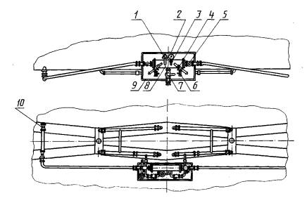 Рис. 2.1. Опора котла восьмиосной цистерны: 1 - пятник; 2, 4 - листы; 3 - диафрагма; 5 - скользун; 6 - шкворневая балка; 7 - хребтовая балка; 8 - боковая обвязка; 9 - концевая балка 3. НЕФТЕБЕНЗИНОВЫЕ И СПИРТОВЫЕ ЦИСТЕРНЫУнифицированные узлы и элементы нефтебензиновых и спиртовых цистерн включают люк-лаз для загрузки продукта и технического обслуживания и доступа внутрь котла, сливной прибор для слива груза, предохранительный клапан для ограничения избыточного давления в котле при повышении температуры груза и предохранительно-впускной клапан для защиты котла от вакуума при охлаждении груза и конденсации его паров. В настоящее время цистерны выпускаются с предохранительно-впускным клапаном, в конструкции которого объединены предохранительный клапан избыточного давления и предохранительно-впускной (вакуумный) клапан. Нижний лист котла цистерны имеет уклон к сливному прибору для обеспечения полного слива продукта. Восьмиосные цистерны имеют по два люка-лаза, сливных прибора и предохранительно-впускных клапана. Люк-лаз 4 (рис. 3.1) диаметром 570 мм герметично закрывается крышкой 1. В новых конструкциях применяется крышка с ригельным запором, включающим ригель 6, откидной болт 5 и предохранительную скобу 2. Эта конструкция обеспечивает надежность уплотнения, удобство и безопасность обслуживания. В горловине люка приварены сегменты 3 для контроля уровня наполнения и прикреплена внутренняя лестница для доступа обслуживающего персонала внутрь котла. При нахождении цистерны в эксплуатации на путях МПС люк-лаз всегда должен быть опломбирован. Пломбирование крышки люка производится перед каждым выходом цистерны на пути МПС как в груженом, так и в порожнем состояниях. Все цистерны данной группы (кроме цистерн для спирта) оборудуются универсальным сливным прибором (рис. 3.2). Вороток 1, шарнирно соединенный с винтовой штангой 2 управления сливным прибором, расположен в горловине люка-лаза. На нижнем конце штанги закреплен клапан 3 с уплотнительным кольцом 9, который при вращении воротка поднимается или опускается на седло 10, обеспечивая таким образом открытие и закрытие сливного прибора. Труба сливного прибора 5 снаружи закрывается откидной крышкой 6, прижимаемой к торцу трубы нажимным винтом 7. Кольцевой наконечник 8 сливной трубы обеспечивает возможность герметичного присоединения сливного рукава. Корпус сливного прибора оборудован кожухом 4, который может при сливе продукта заполняться паром для обогрева в зимнее время. Цистерна для спирта модели 15-1454 с 1986 г. поставляется без нижнего сливного прибора. Разгрузка цистерны на пунктах слива производится сифонированием сверху через специально оборудованный для ввода сливной трубы люк. Внизу котел имеет поддон. У остальных цистерн для спирта сливной прибор демонтирован, а отверстие внизу заварено. На горловине люка приварены проушины для двух замков. На крышке люка наварено дополнительное лабиринтное кольцо. Предохранительно-впускной клапан зафиксирован двумя скобками. Предохранительно-впускной клапан (рис. 3.3) имеет раздельную регулировку усилия затяжки пружины 1 клапана максимального давления 2 и пружины 3 вакуумного клапана 4. Регулировка клапанов производится на избыточное давление 0,15 МПа (1,5 кгс/см2) и на разряжение 0,01 - 0,02 МПа (0,1 - 0,2 кгс/см2) . Для предотвращения нарушения регулировки на 